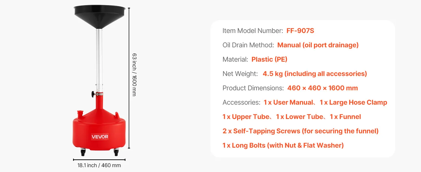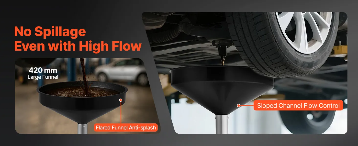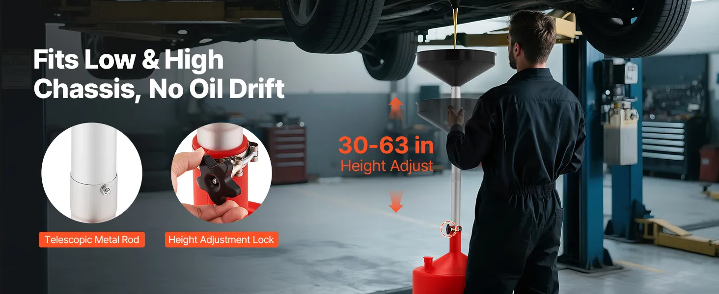 Regulējams augstums: Ar augstuma diapazonu no 76 līdz 160 centimetriem šī eļļas noteces ierīce pielāgojas dažādiem transportlīdzekļiem, nodrošinot ciešu savienojumu un novēršot noplūdes. Ideāli piemērota darbnīcām, servisiem vai mājas garāžām.
