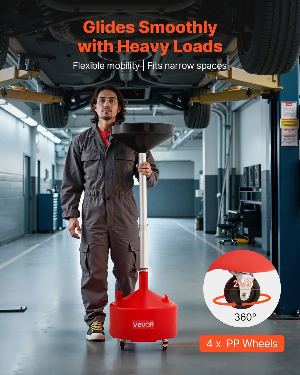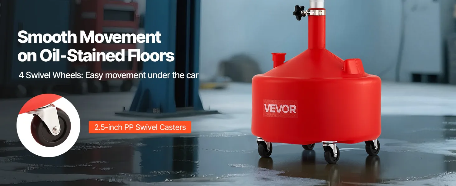 Viegla pārvietošana: Pārvietojamā eļļas noteces tvertne ar četriem 6,4 centimetru grozāmiem riteņiem nodrošina vienmērīgu pārvietošanu sarežģītā vidē, piemēram, auto remontdarbnīcās vai personīgās garāžās.