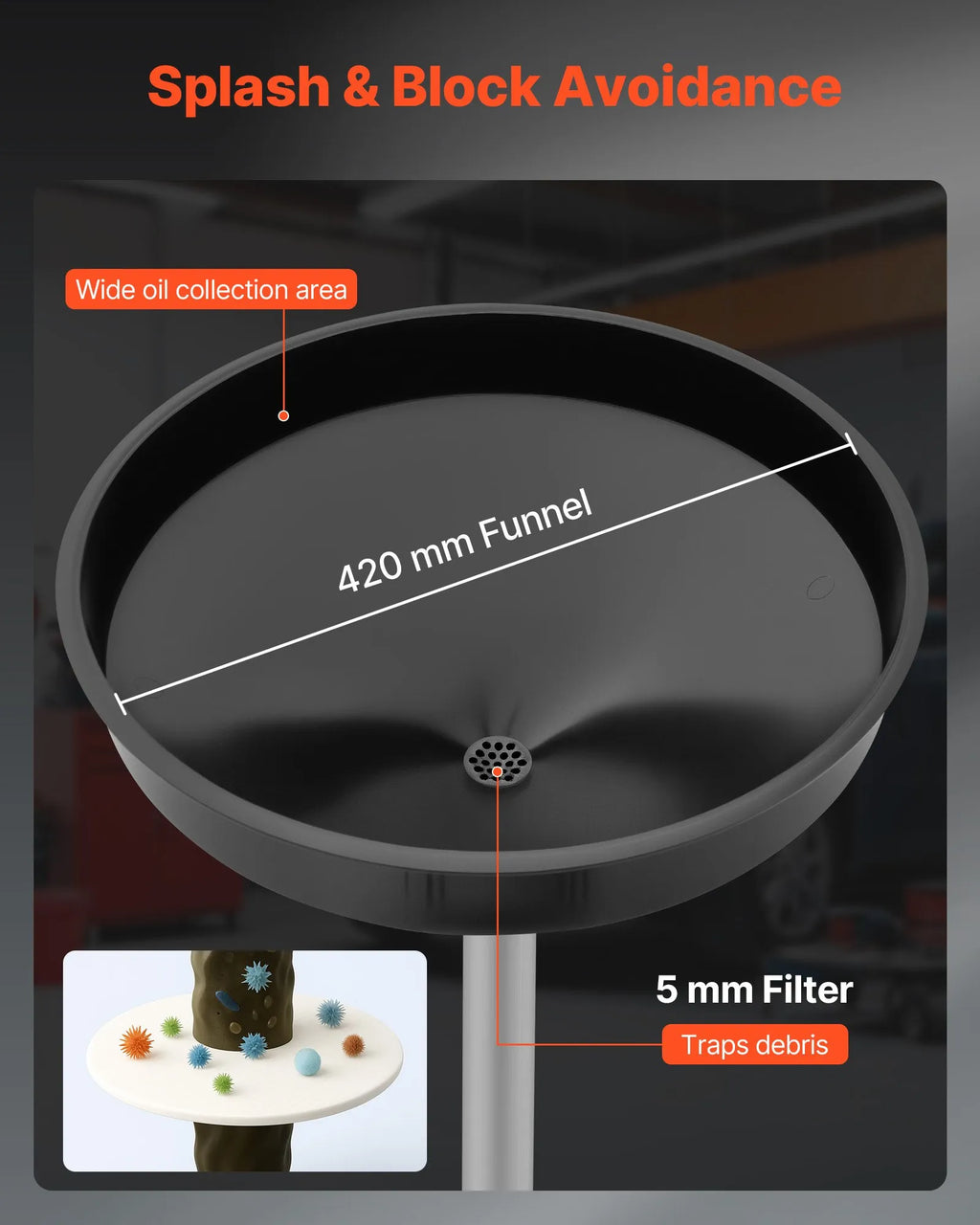 Noplūdes droša konstrukcija: Eļļas noteces tvertne ir aprīkota ar 42 centimetru platu noplūdēm izturīgu piltuvi, kas uzlabo eļļas savākšanu. Komplektā iekļauta papildu hermētiskā lente un skavas papildu aizsardzībai pret noplūdēm, novēršot pārplūdi un izšļakstīšanos.