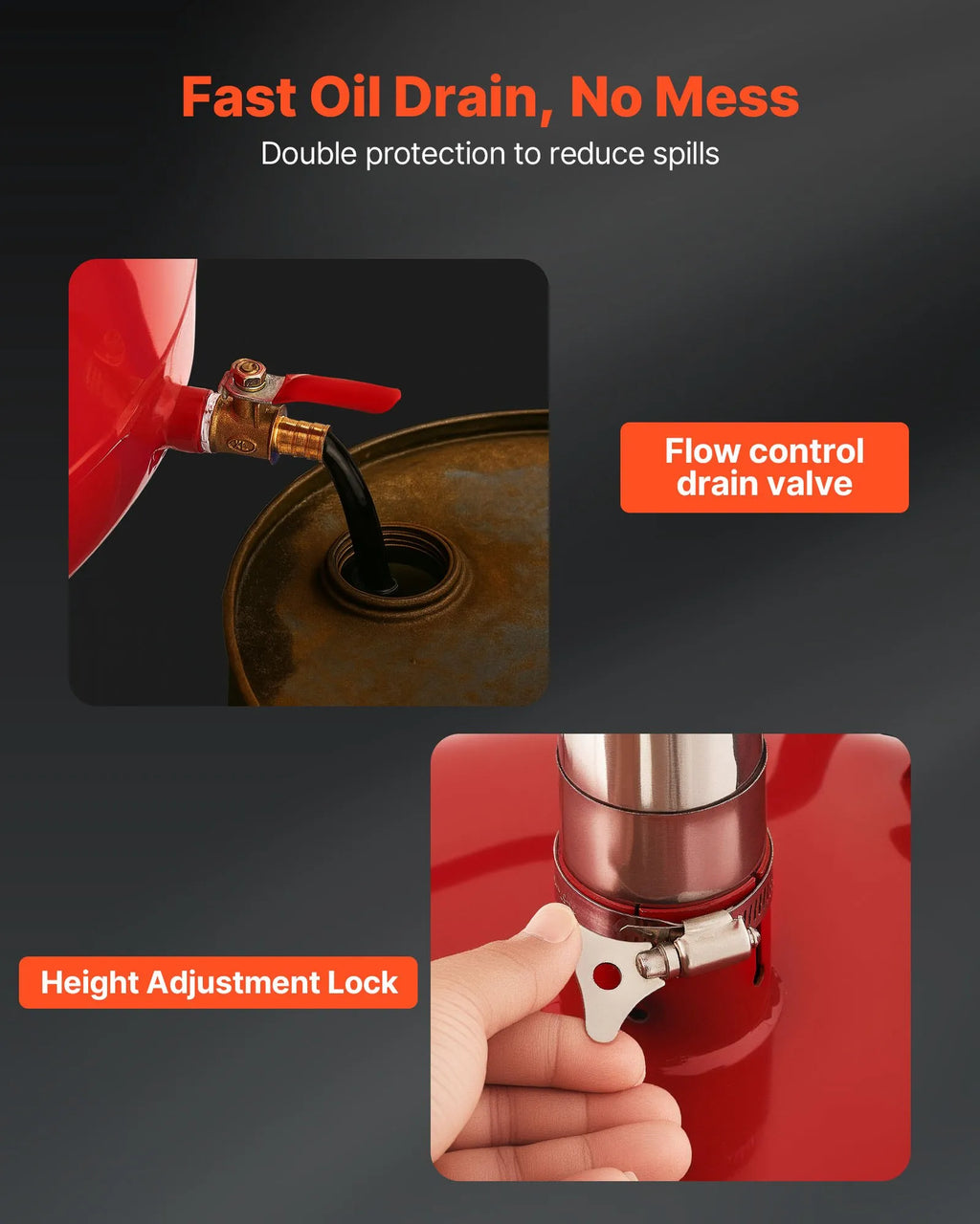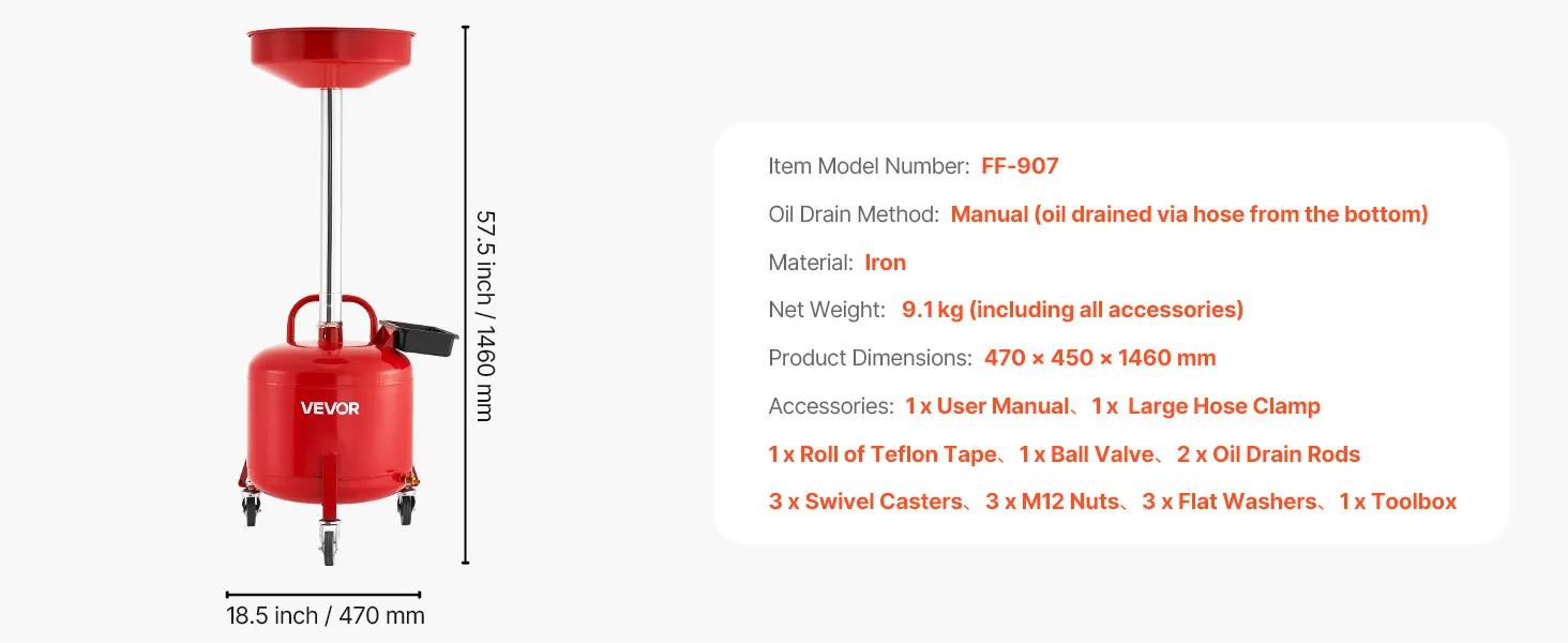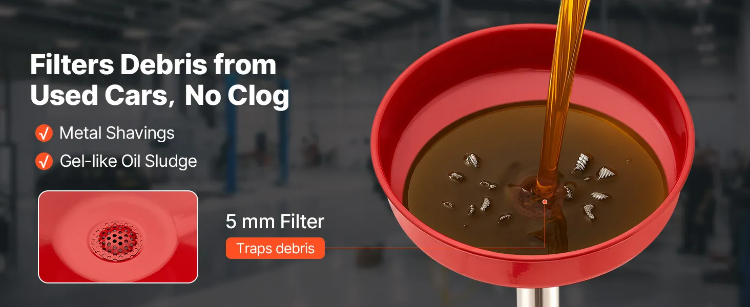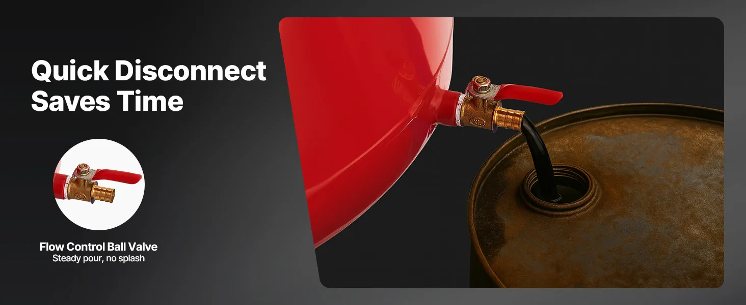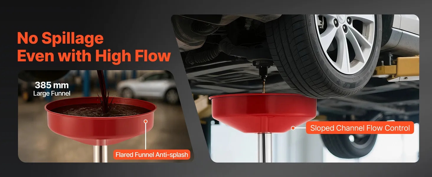 Noplūdes droša konstrukcija: Eļļas noteces tvertne ir aprīkota ar 38,5 centimetru platu piltuvi ar aizsardzību pret izšļakstīšanos, kas uzlabo eļļas savākšanas efektivitāti. Komplektā ietilpst papildu hermētiskā lente un skavas noplūžu novēršanai, novēršot pārplūdes un izšļakstīšanos.