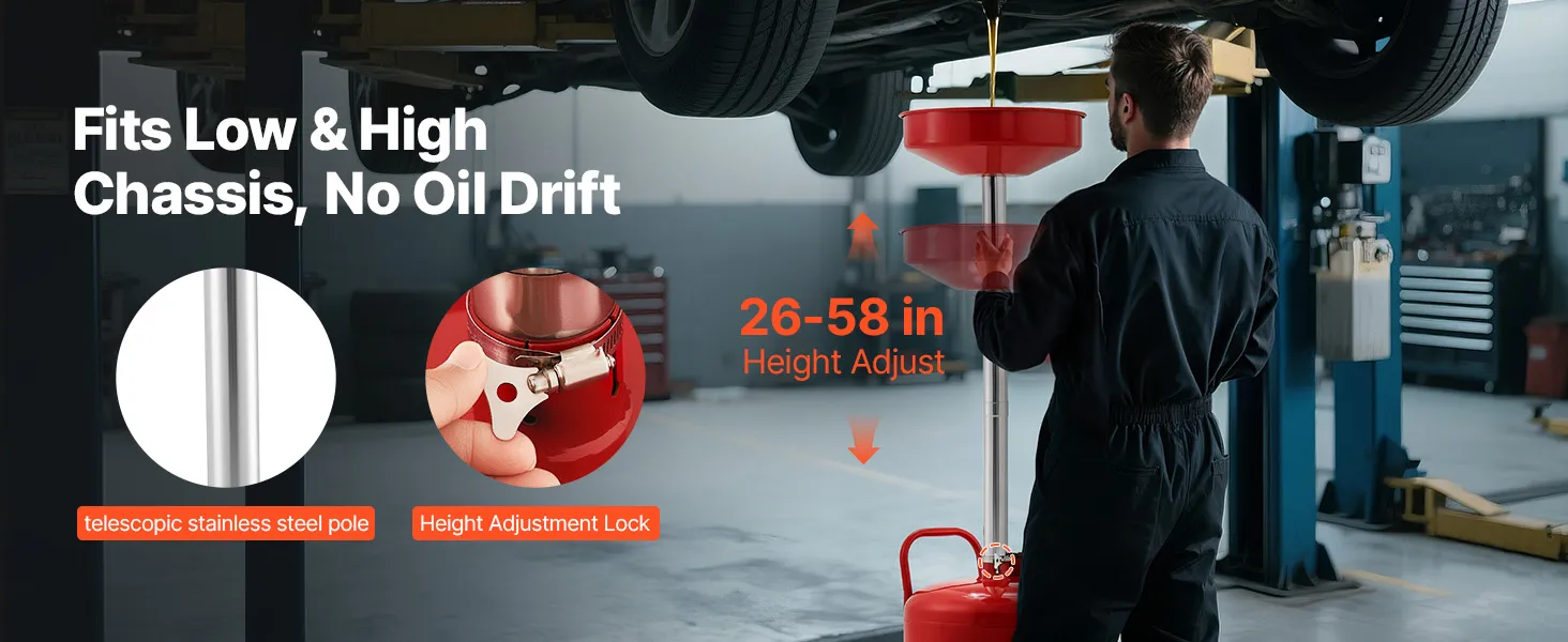 Regulējams augstums: Ar augstuma diapazonu no 66 līdz 147 centimetriem šī eļļas noteces ierīce pielāgojas dažādiem transportlīdzekļiem, nodrošinot ciešu savienojumu un novēršot noplūdes. Ideāli piemērota darbnīcām, autoservisiem vai mājas garāžām.