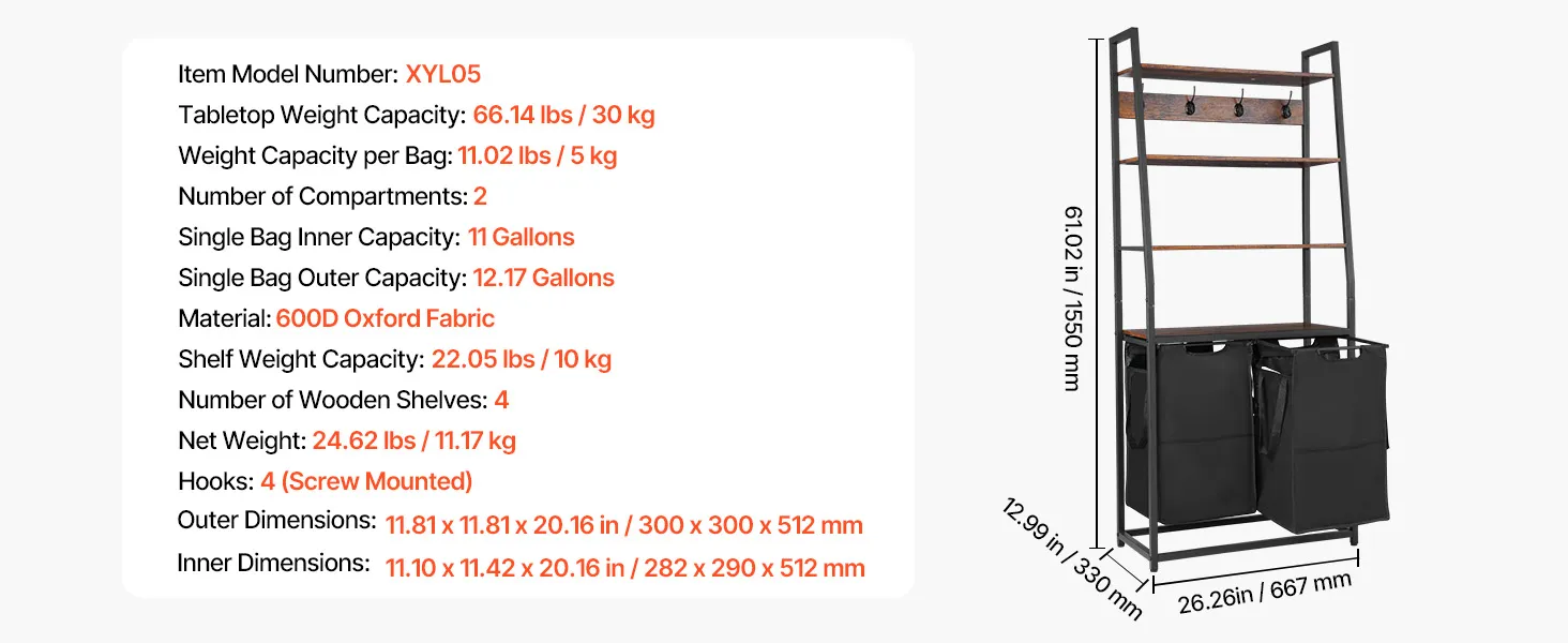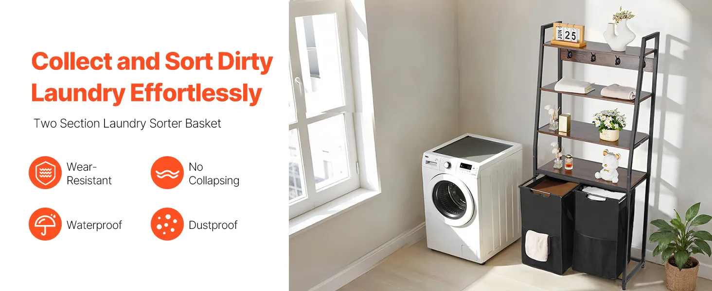 Nodilumizturīgi auduma maisi: izgatavoti no 600D oksforda auduma, šie maisi ir izturīgi, ūdensnecaurlaidīgi un viegli tīrāmi. PP pamatne uztur maisus taisnus un novērš iegrimšanu, kad tie ir piepildīti ar veļu. Katrs maiss iztur līdz 5 kg, viegli noturot arī biezas drēbes