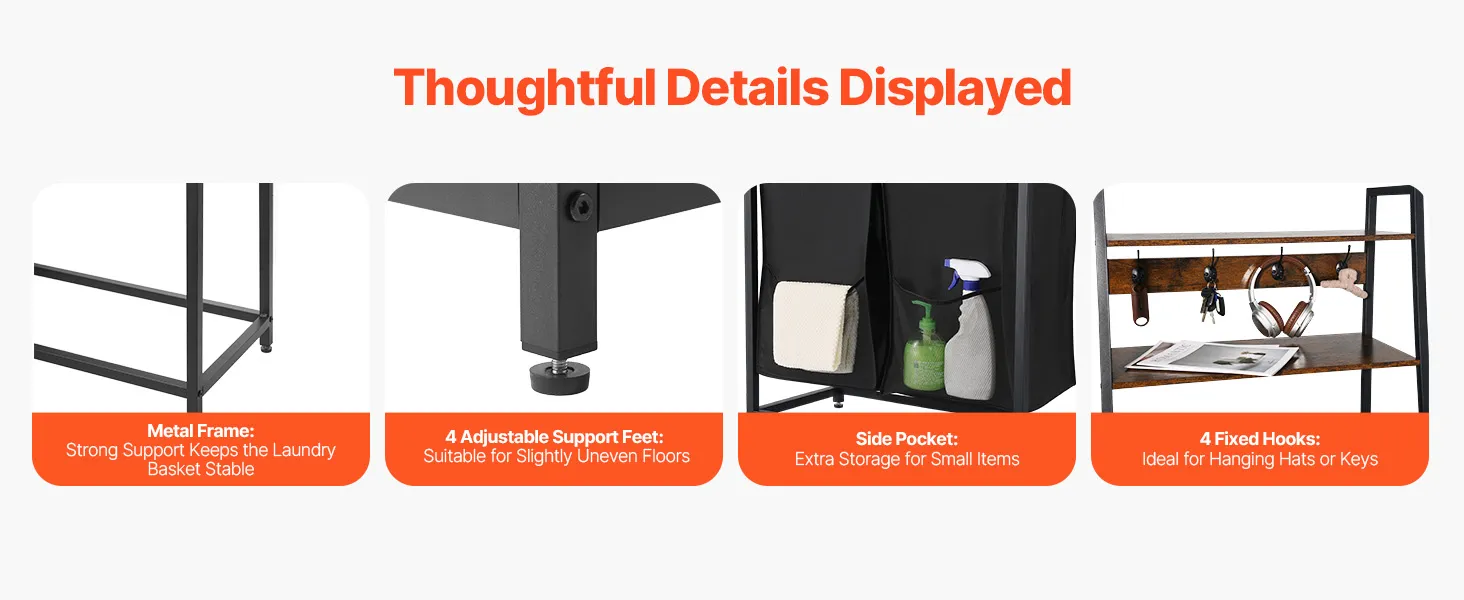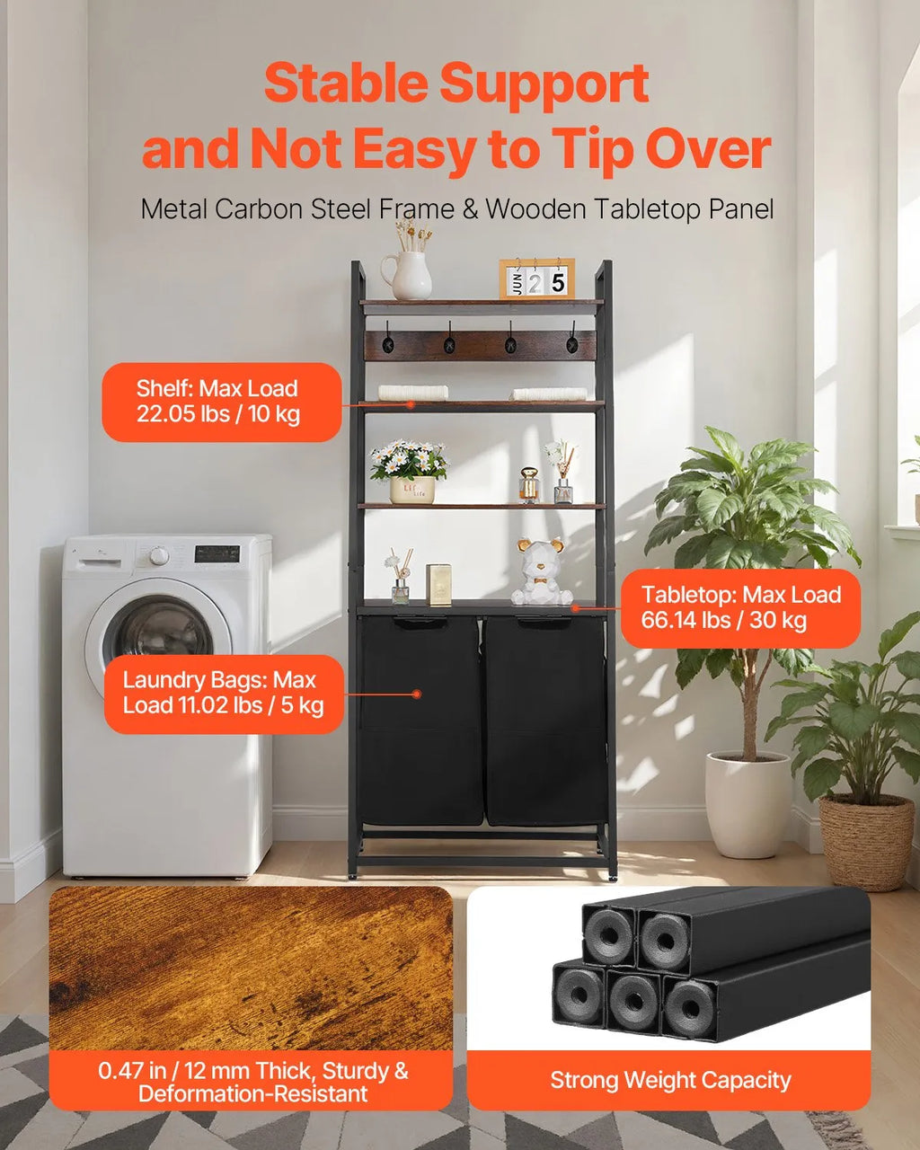 Izturīga konstrukcija: izgatavots no melna metāla oglekļa tērauda, kas nodrošina spēcīgu atbalstu un ir izturīgs pret deformāciju. Aprīkots ar 4 regulējamām PP kājiņām, kas palīdz stabilizēt veļas šķirotāju uz nelīdzenām grīdām drošai lietošanai