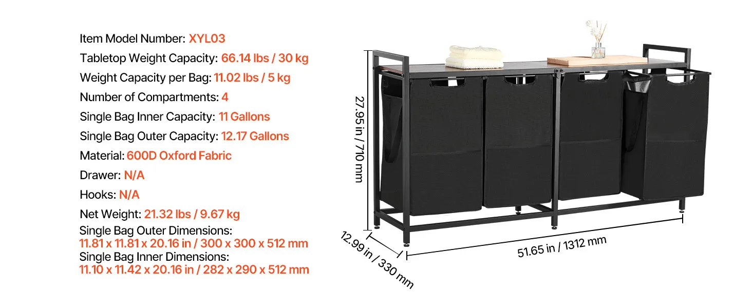Nodilumizturīgi auduma maisi: izgatavoti no 600D oksforda auduma, šie maisi ir izturīgi, ūdensnecaurlaidīgi un viegli tīrāmi. PP pamatne uztur maisus taisnus un novērš iegrimšanu, kad tie ir piepildīti ar veļu. Katrs maiss iztur līdz 5 kg, viegli noturot arī biezas drēbes