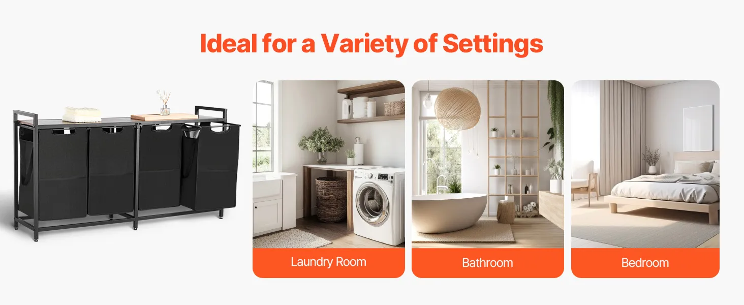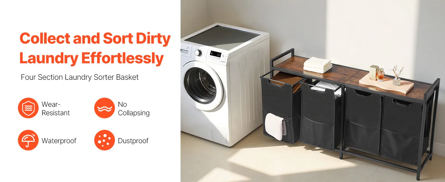 Ērta šķirošana un uzglabāšana: četri auduma maisi un ārējā kabata nodrošina kopējo ietilpību 184 l. Viegli atdaliet gaišo un tumšo veļu, pieaugušo un bērnu drēbes vai zeķes no dvieļiem