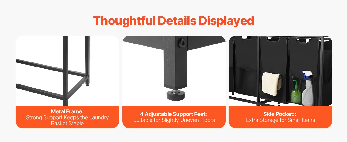 Izturīga konstrukcija: izgatavots no melna metāla oglekļa tērauda, kas nodrošina spēcīgu atbalstu un ir izturīgs pret deformāciju. Aprīkots ar 4 regulējamām PP kājiņām, kas palīdz stabilizēt veļas šķirotāju uz nelīdzenām grīdām drošai lietošanai