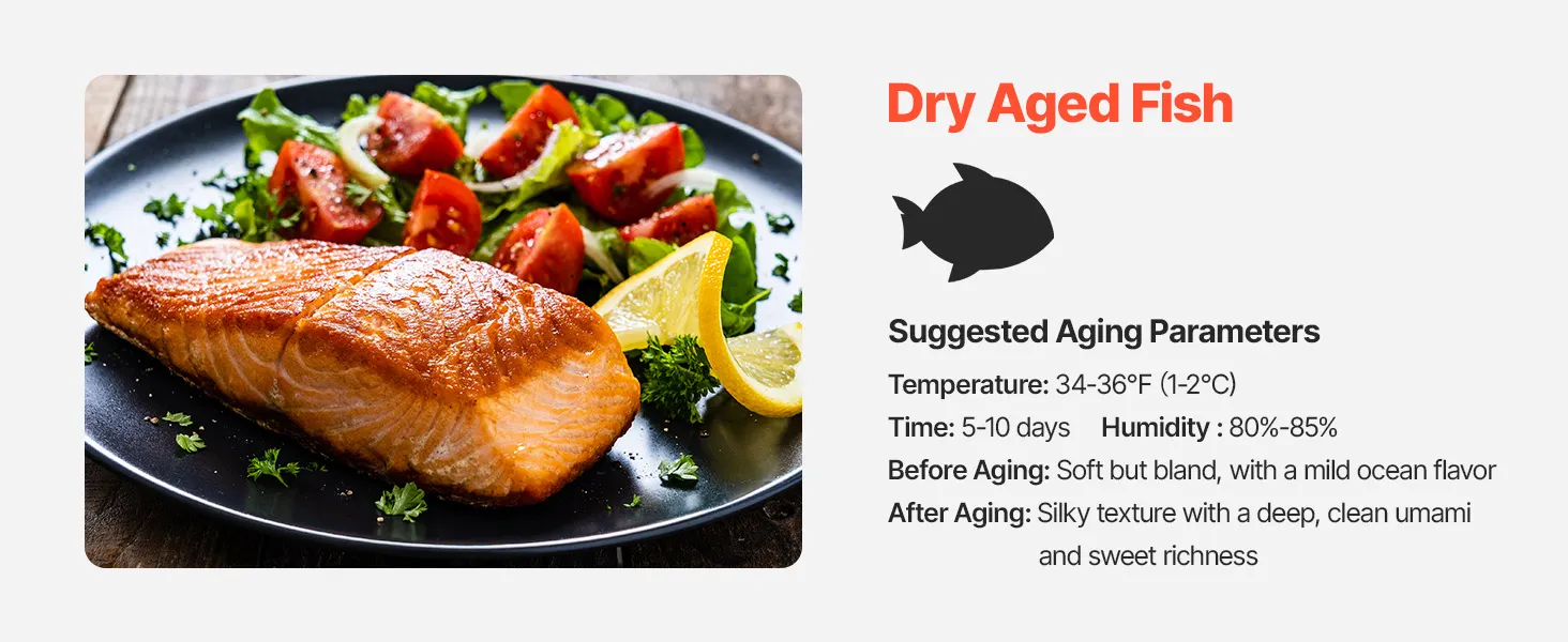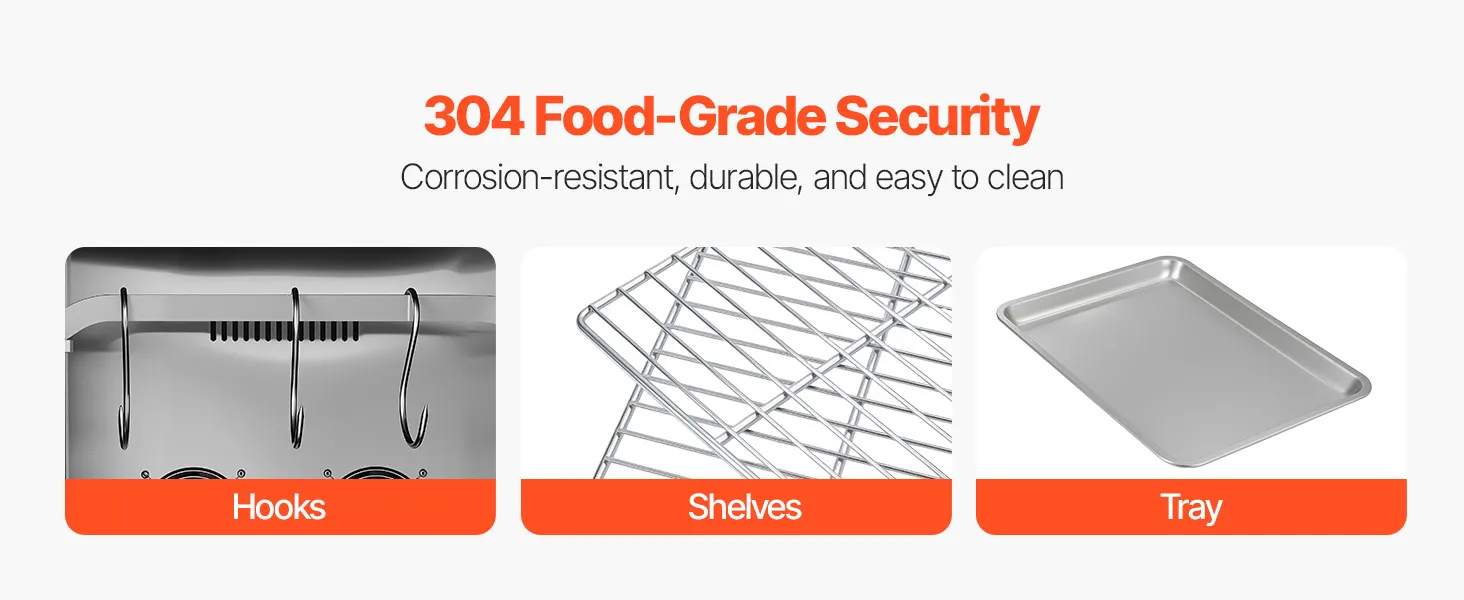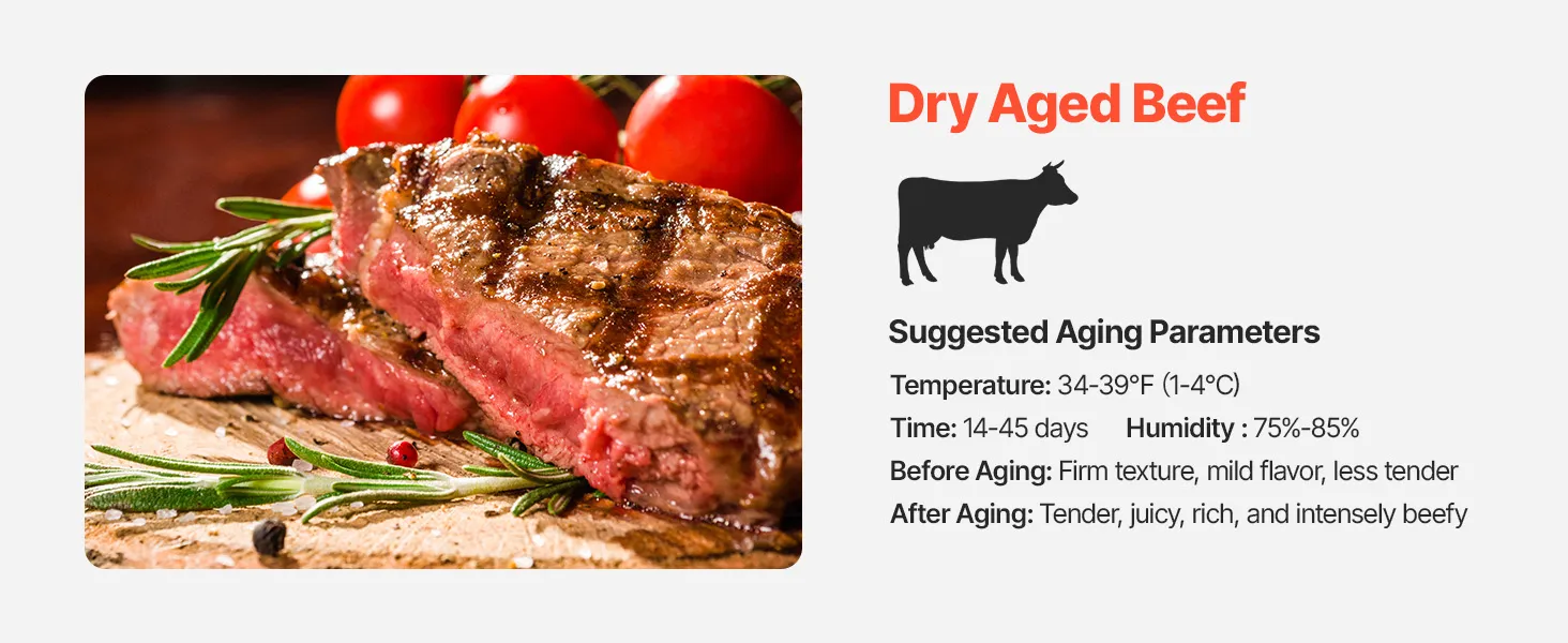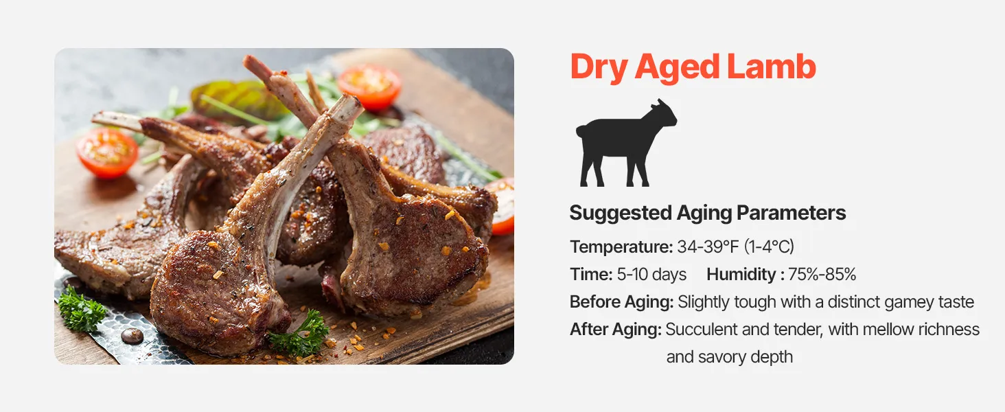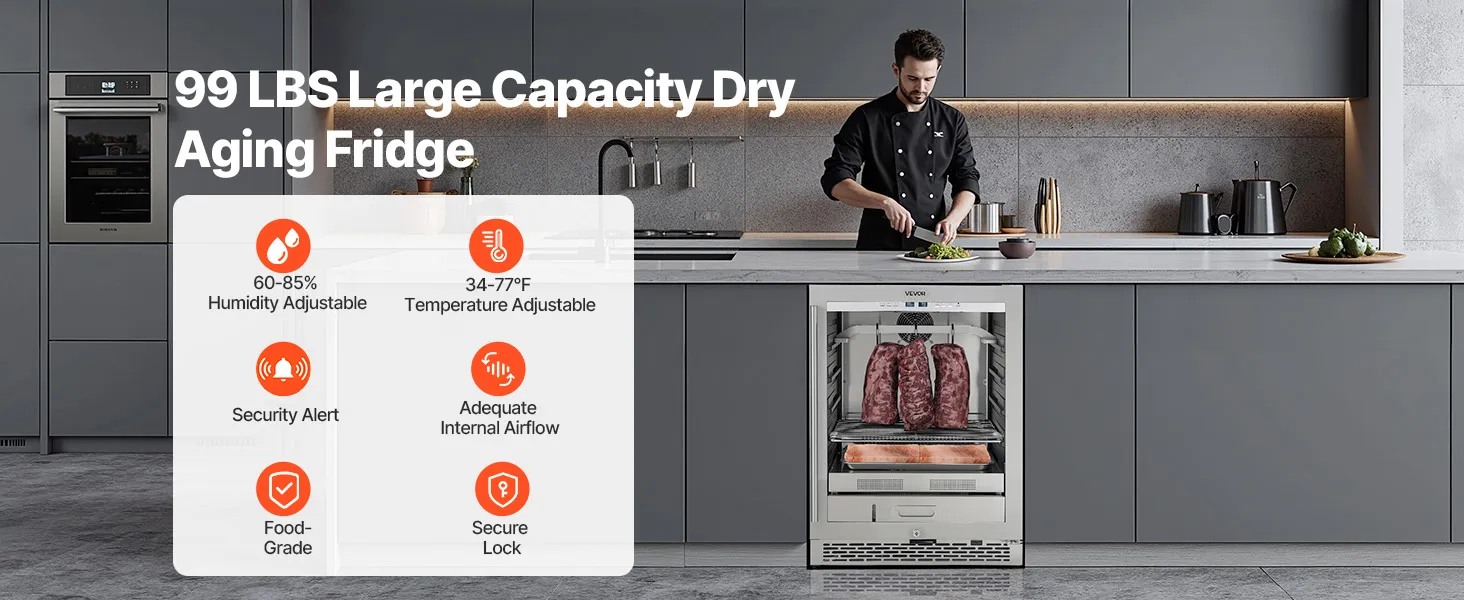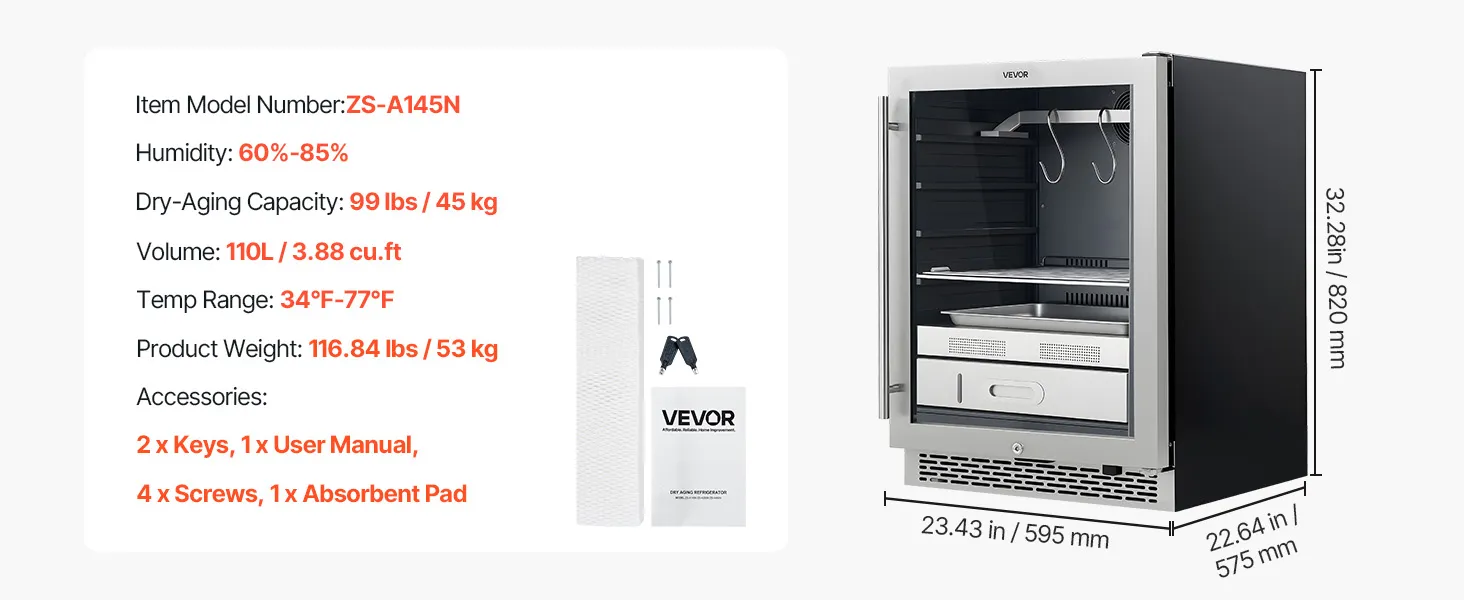 45 kg ietilpība: šis sausās nogatavināšanas ledusskapis ir aprīkots ar noņemamiem āķiem, plauktiem un paplātēm ērtai gaļas kārtošanai. Katrs āķis iztur līdz 5 kg, katrs plaukts līdz 30 kg, kopējā ietilpība 45 kg — ideāli piemērots gan mājai, gan komerciālai lietošanai.
