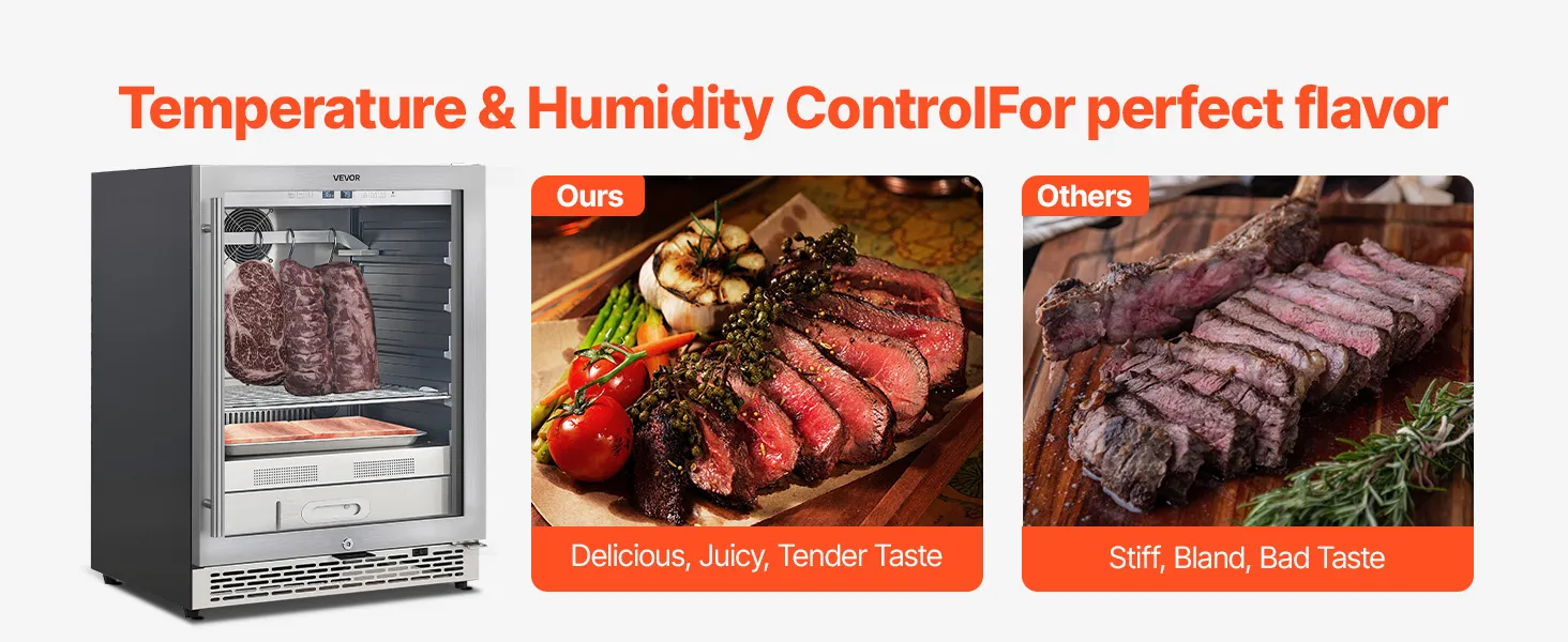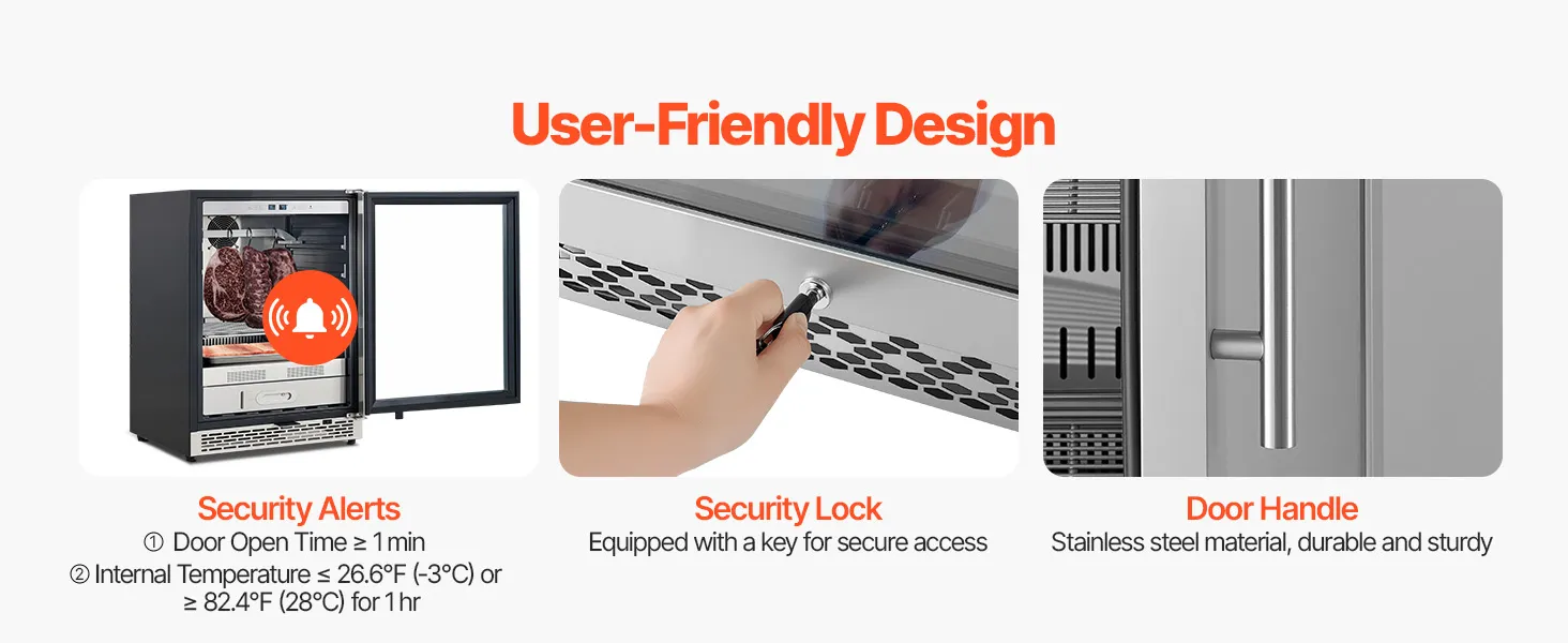 Profesionāla nogatavināšanas vide: šis gaļas nogatavināšanas ledusskapis uztur tīru gaisu un stabilus apstākļus, nodrošinot vienmērīgu un drošu nogatavināšanu ar uzlabotu garšu. Komplektā iekļauta atslēga drošībai.