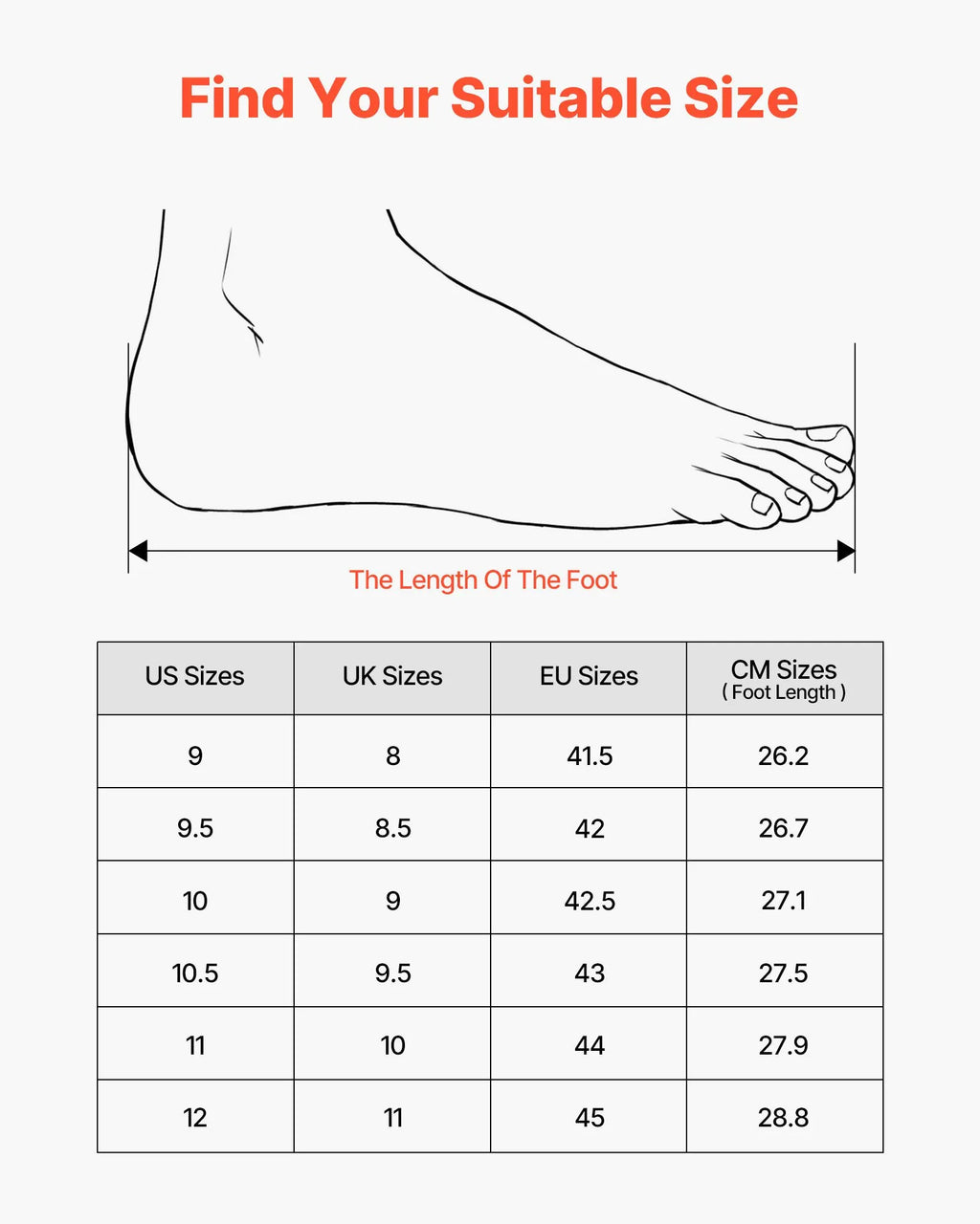 • Dažādi izmēri: Pieejami plašā diapazonā — US, UK un ES izmēri. Pirms iegādes ieteicams izmērīt pēdas garumu, lai nodrošinātu precīzu piegulšanu un maksimālu komfortu.