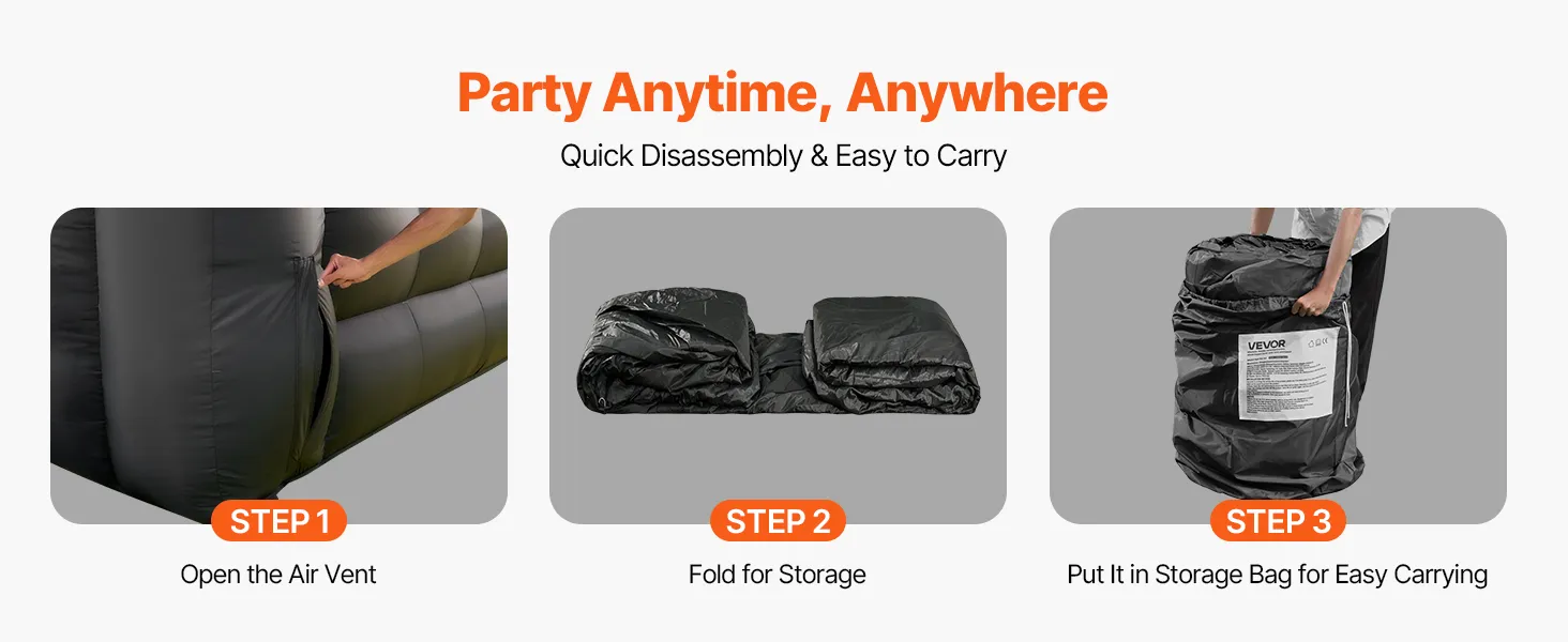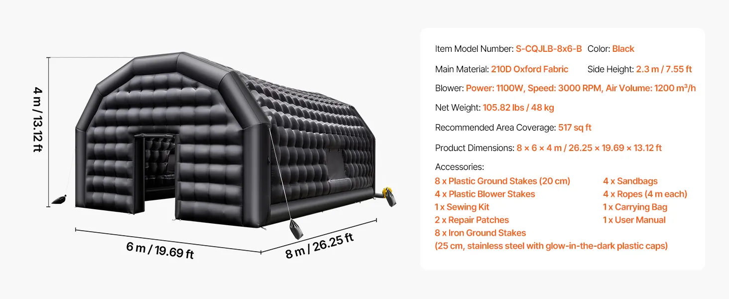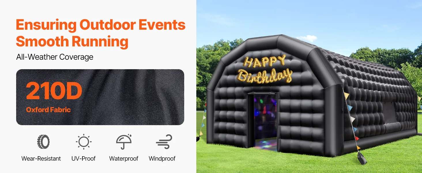 Izturīgi materiāli: Izgatavota no 210D “Oxford” auduma, kas ir ūdens un vēja izturīgs. Šī uzpūšamā ballīšu telts lieliski iztur vieglu lietu un vēju, nodrošinot pasākuma norisi bez traucējumiem.