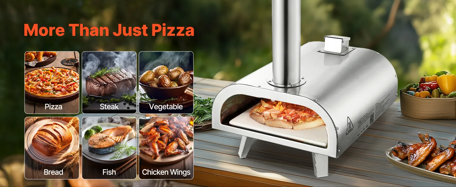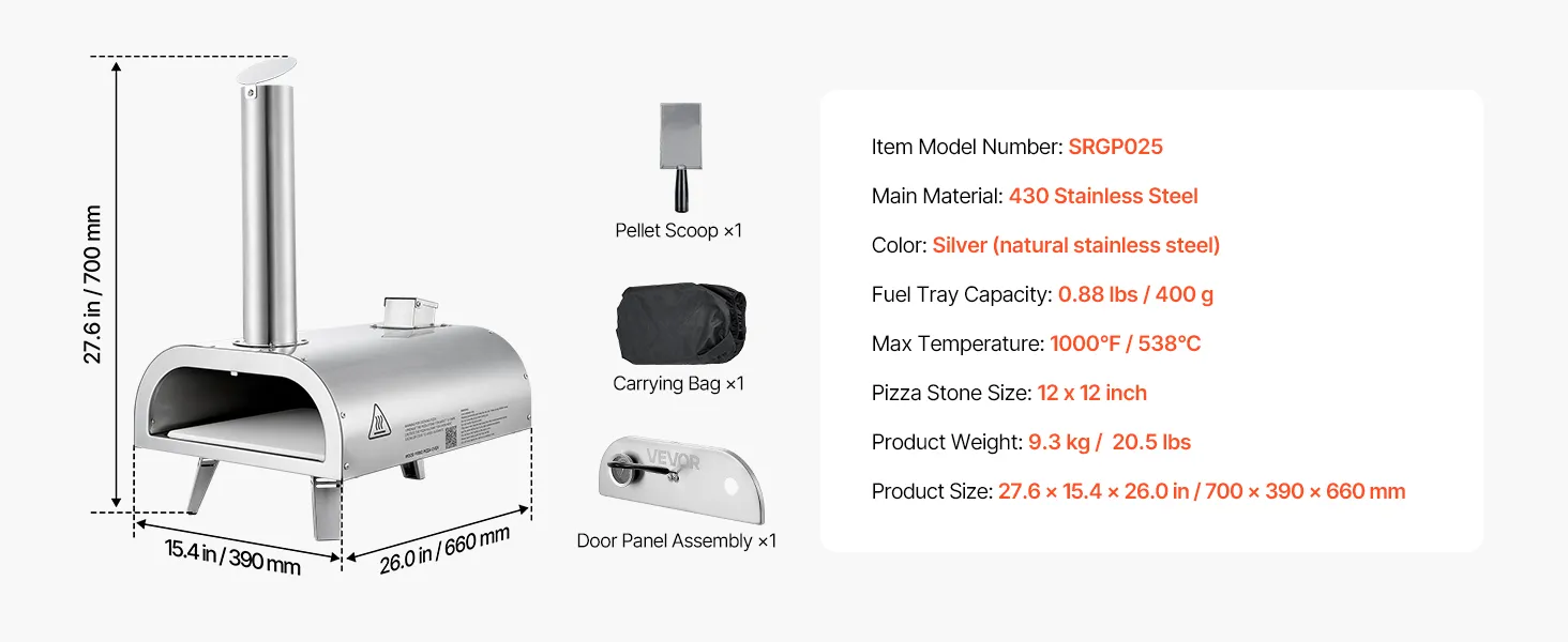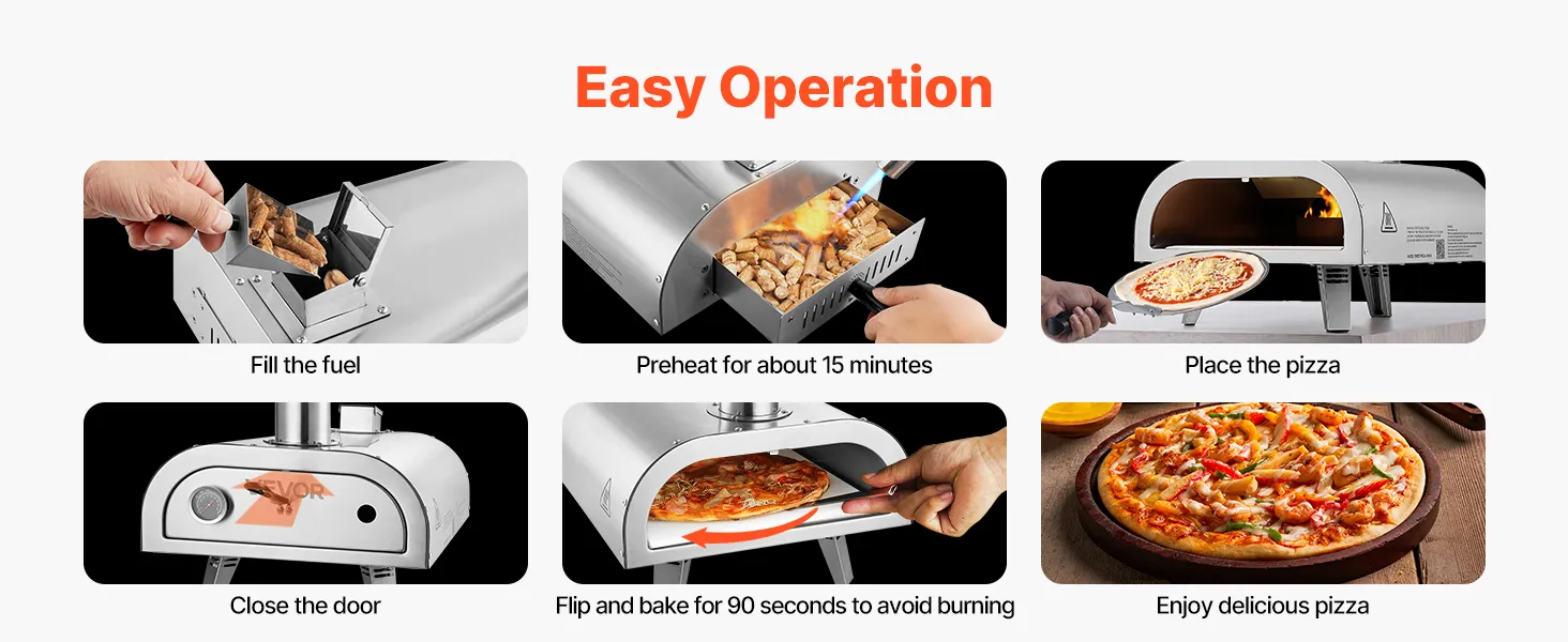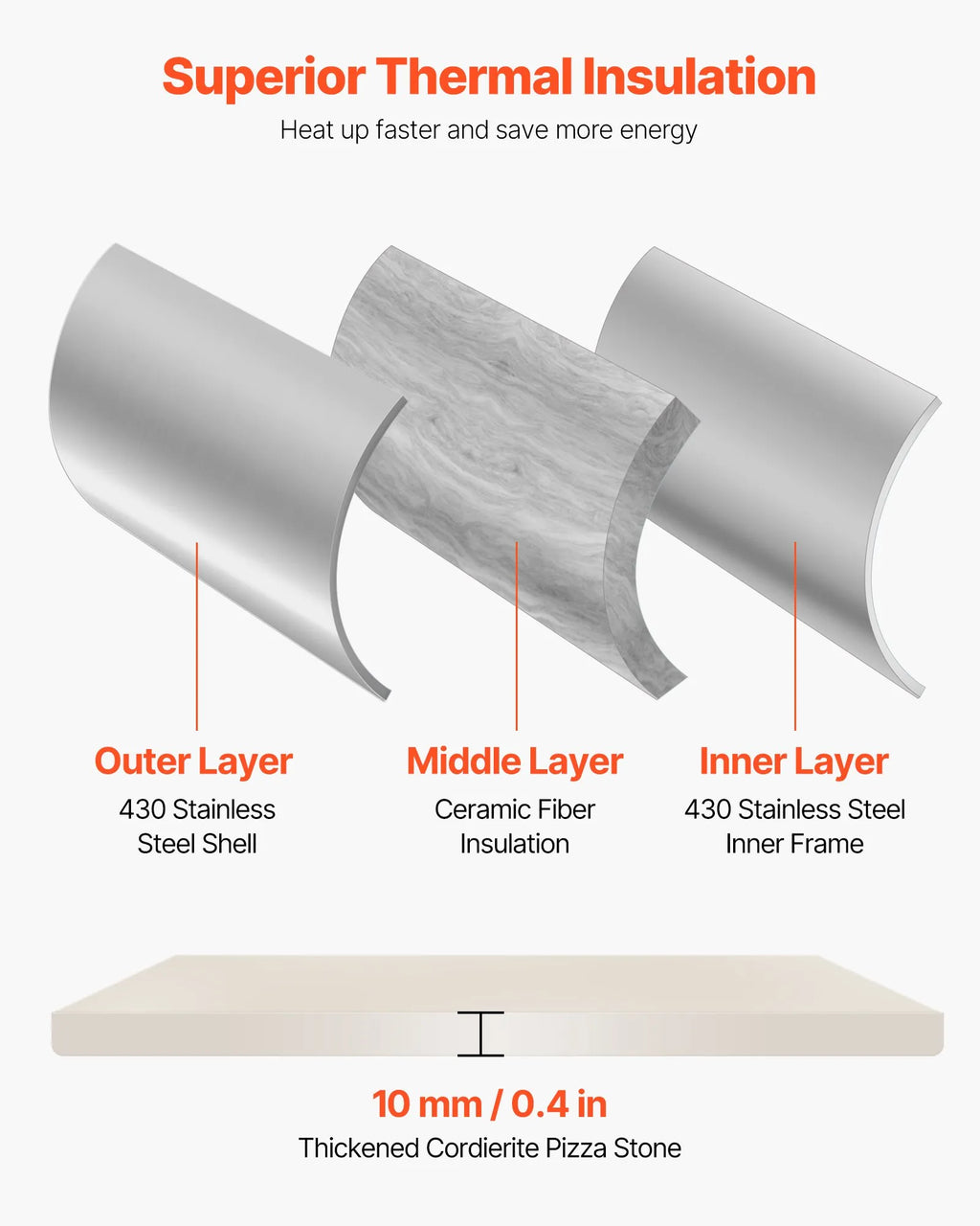 Izturīga konstrukcija: picu krāsns ir piemērota lietošanai ārā un biežai gatavošanai. Trīsslāņu konstrukcija nodrošina efektīvu siltuma cirkulāciju. Korpuss no 430 nerūsējošā tērauda un bieza izolācijas kokvilna garantē izturību un lielisku siltuma saglabāšanu.