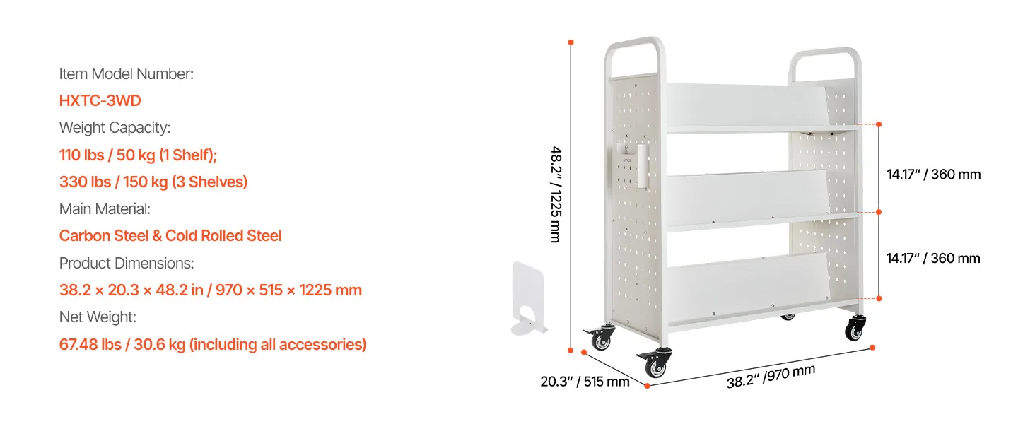 Ļoti liela ietilpība: šiem 3 līmeņu grāmatu ratiņiem ar 359 mm augstiem plauktiem ir plaša vieta grāmatām vai biroja piederumiem. Tie aprīkoti arī ar sānu nodalījumiem A4 mapēm vai planšetēm — ideāli bibliotēkām, mājām un citām vajadzībām