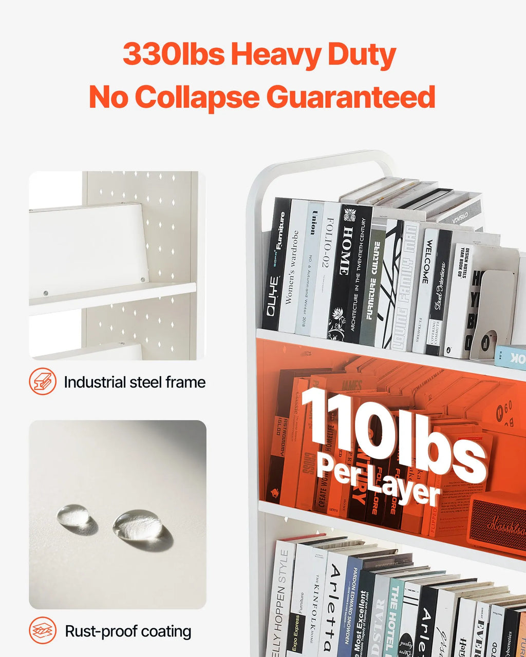 Stabila nestspēja: izgatavoti no augstas stiprības oglekļa tērauda, katrs līmenis iztur līdz 50 kg, ar kopējo kravnesību 150 kg. Pretkorozijas pārklājums nodrošina ilgmūžību, padarot ratiņus piemērotus smagām grāmatām vai aprīkojumam
