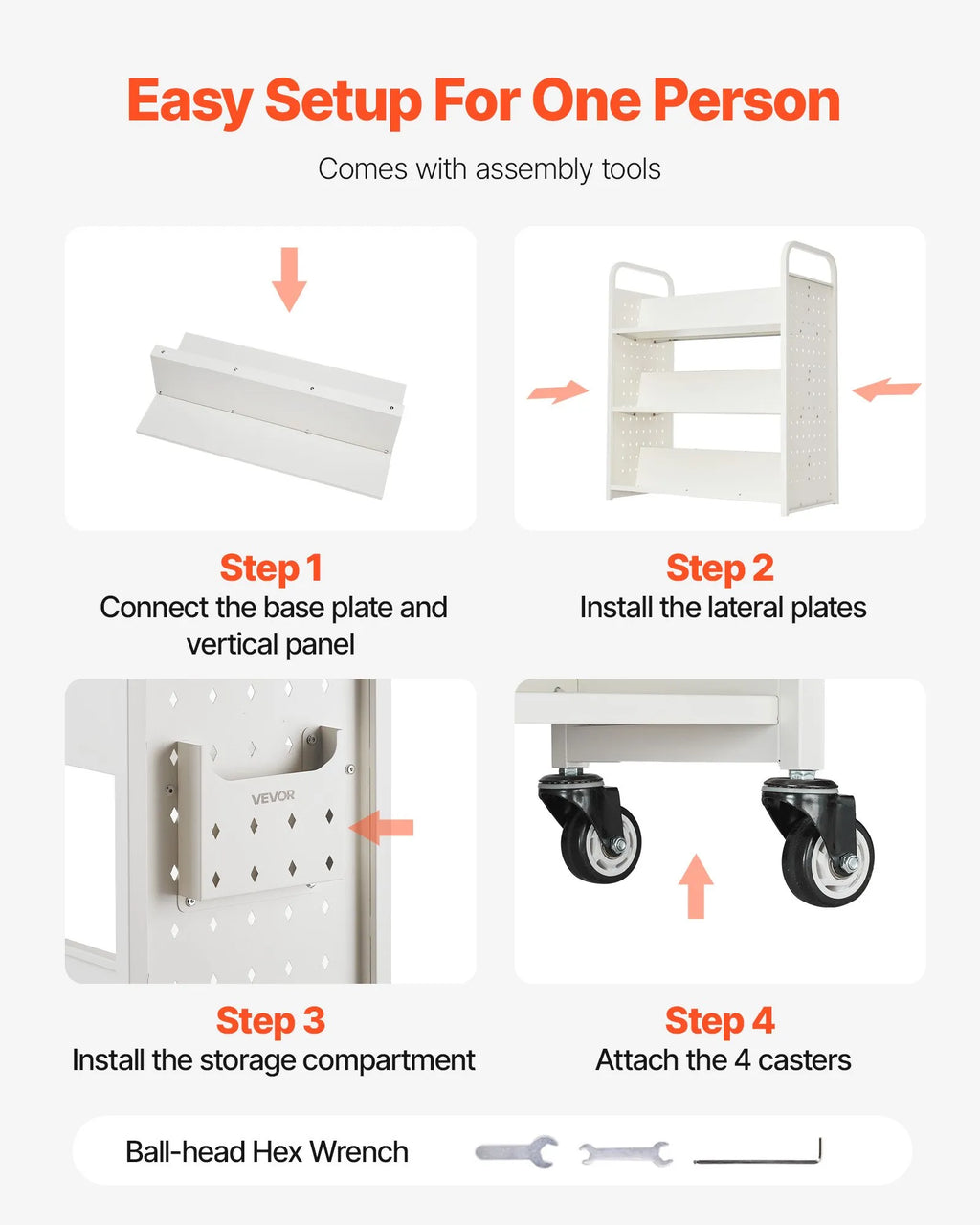 Ātra uzstādīšana: nav nepieciešami sarežģīti instrumenti. Bibliotēkas ratiņi ir viegli samontējami, pateicoties iepriekš izurbtajām atverēm. Komplektā iekļauta uzstādīšanas instrukcija un papildu skrūves ērtākai montāžai
