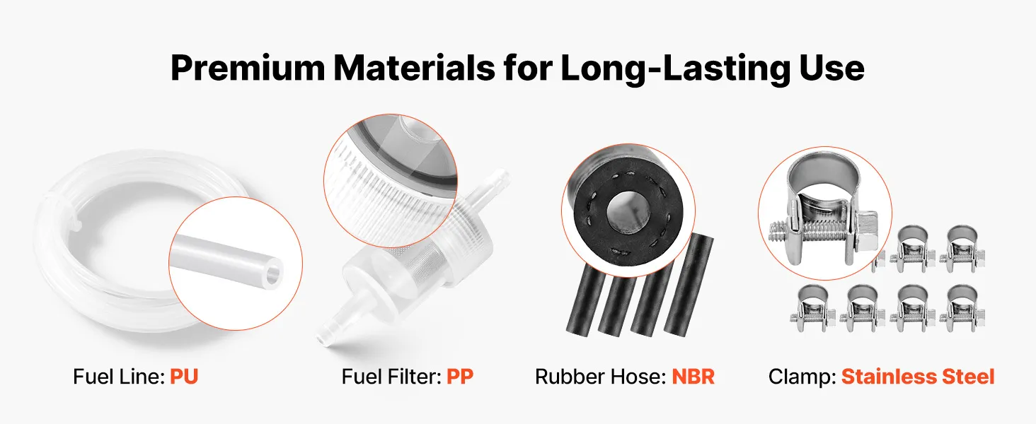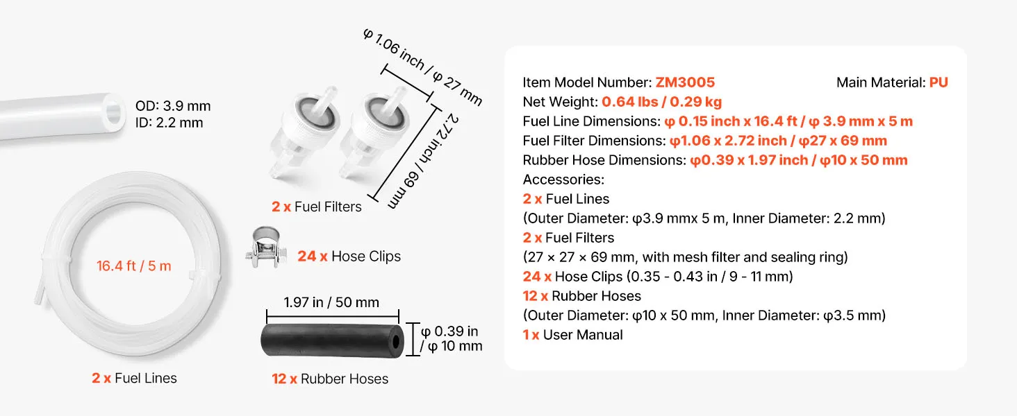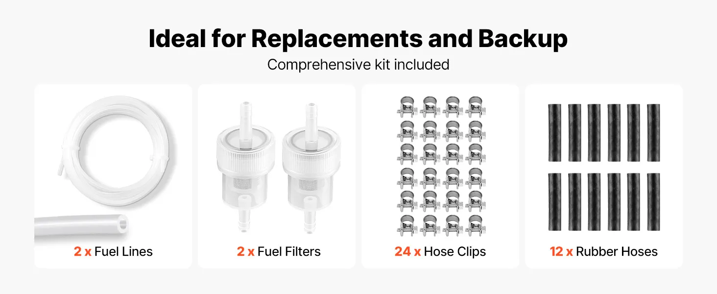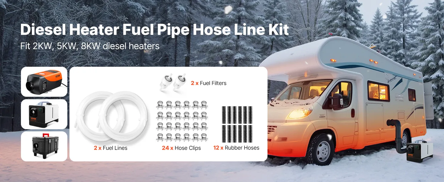 Komplektā ietilpst viss nepieciešamais degvielas padeves šļūteņu nomaiņai: 2 degvielas šļūtenes, 2 filtri, 24 skavas un 6 šļūtenes. Paredzēts uzstādīšanai un apkopei lielākajai daļai 2 kW / 5 kW / 8 kW dīzeļa gaisa sildītāju.