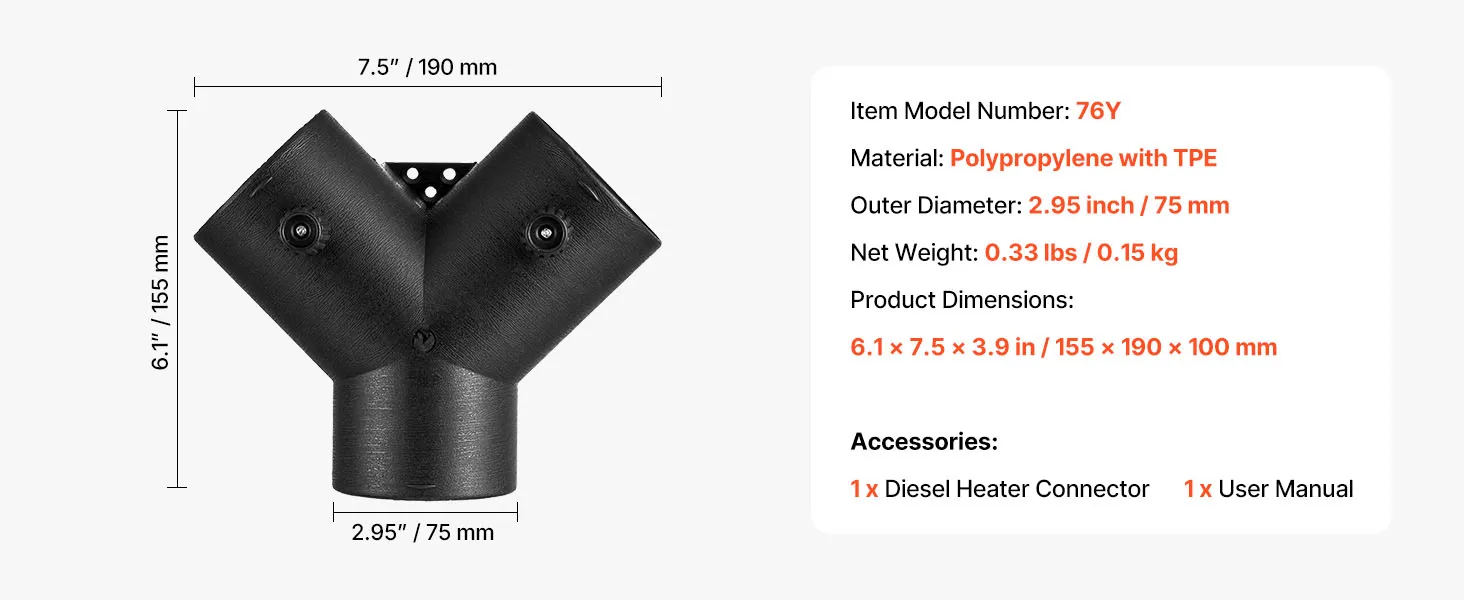 Izturīgs Y veida adapteris: Mūsu dīzeļsildītāja gaisa vada Y veida savienotājs uzlabo gaisa plūsmu un siltā gaisa novadīšanu tur, kur tas nepieciešams. Tas ir ērts risinājums gaisa sadales kontrolei un piemērots dažādām dīzeļsildītāju uzstādīšanas un apkopes vajadzībām.