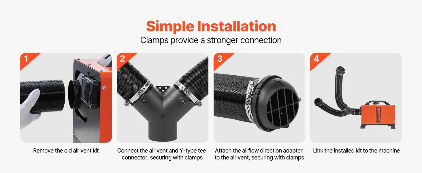 Ar VEVOR dīzeļsildītāja savienotāju komplektu uzstādīšanu var pabeigt tikai 4 soļos.
