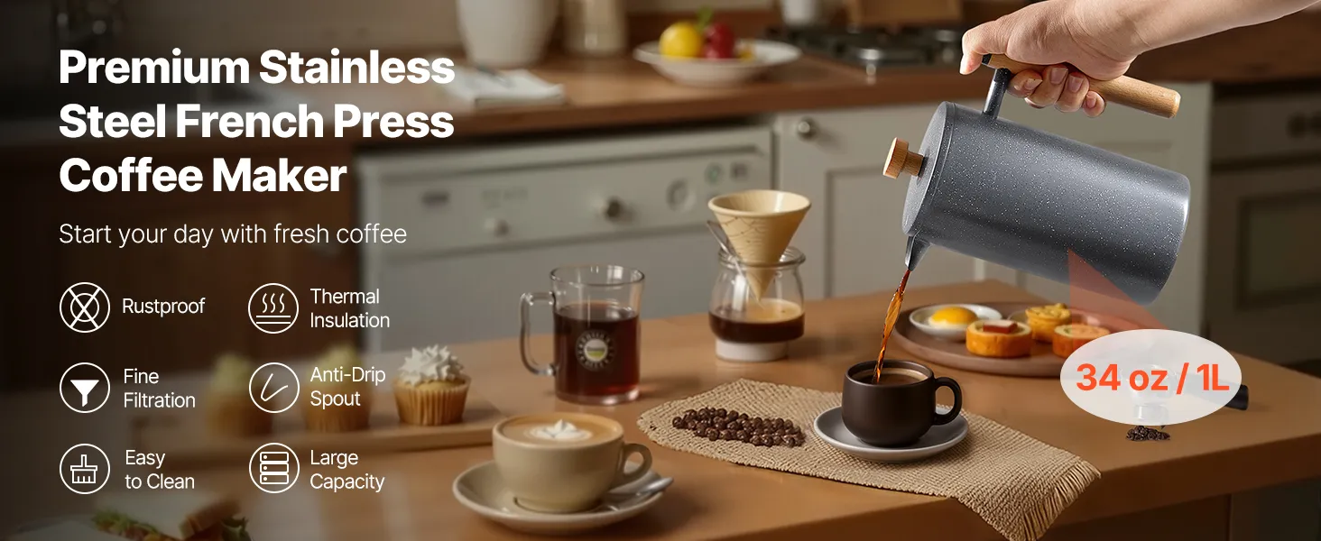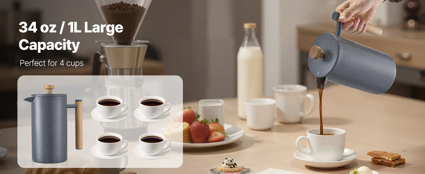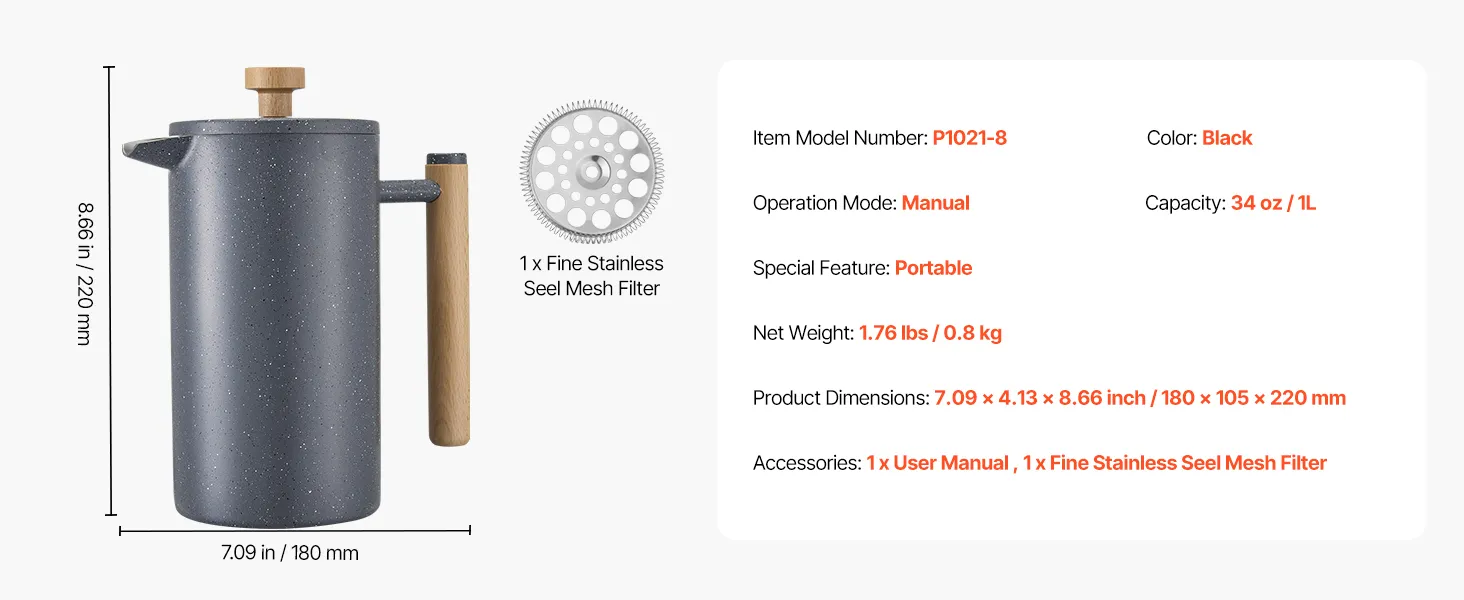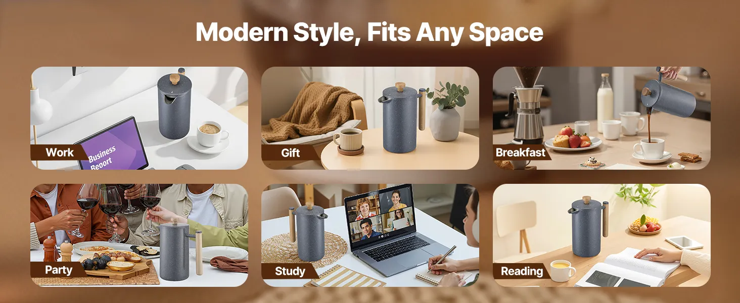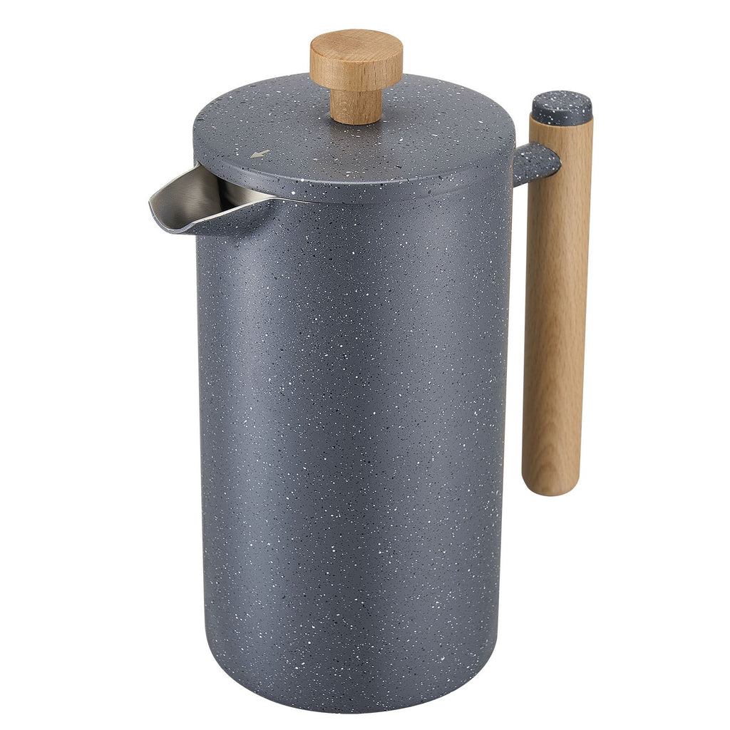 Daudzpusīga lietošanā: melnā nerūsējošā tērauda franču prese ar 1 l ietilpību piemērota ne tikai kafijai, bet arī tējai, aukstajai kafijai vai piena putošanai. Matētā raibā apdare un koka rokturis lieliski iederas jebkurā modernā interjerā, padarot to piemērotu gan mājām, gan birojam.