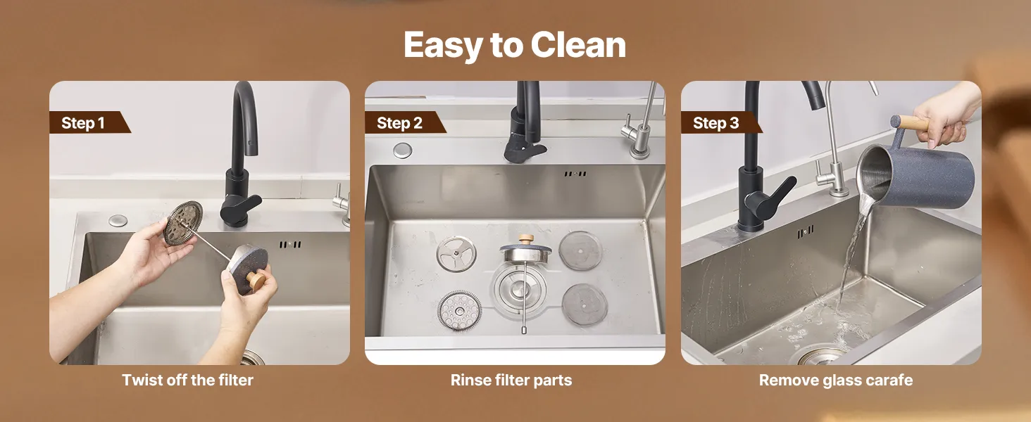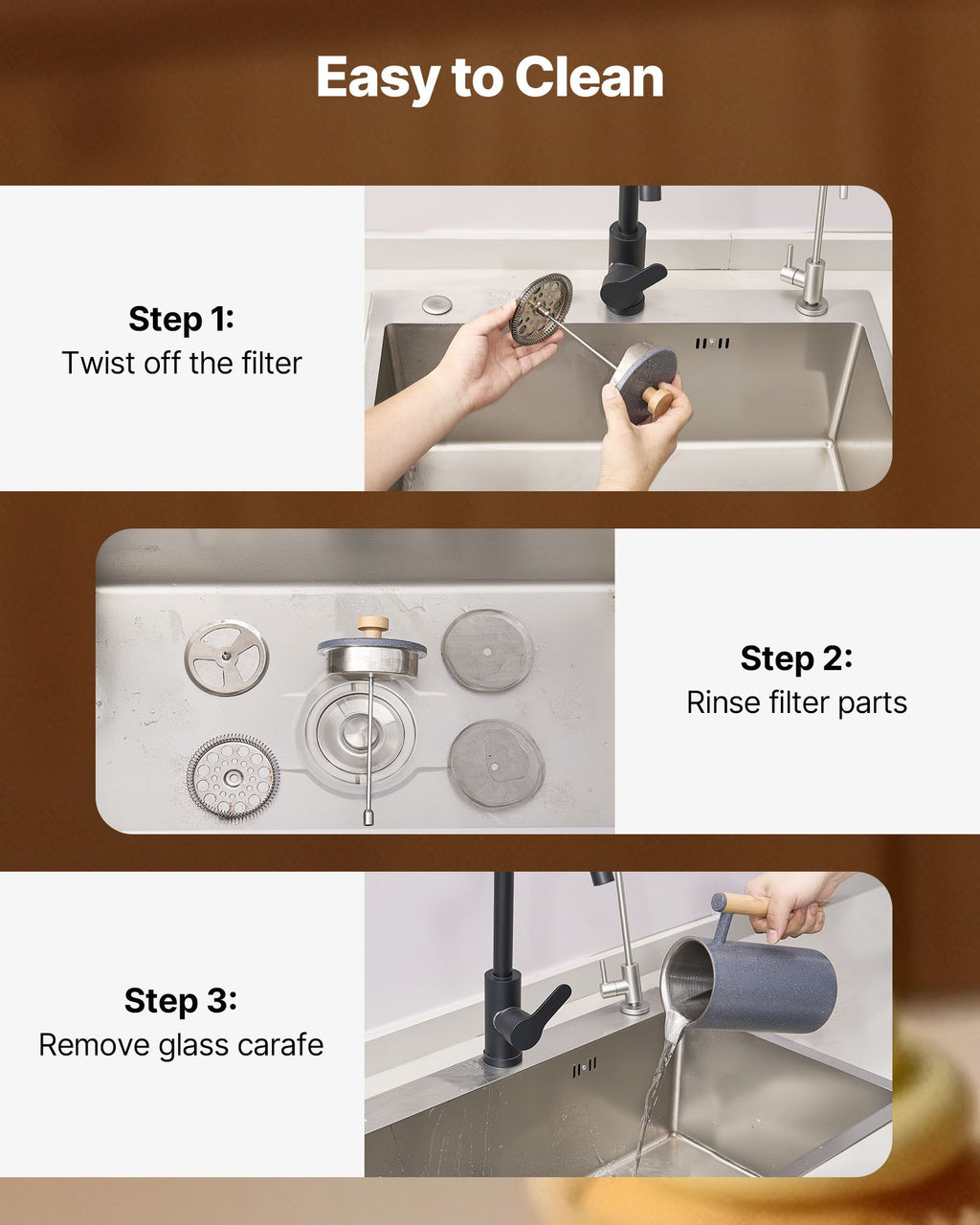 Viegla tīrīšana: franču kafijas prese ar gludu nerūsējošā tērauda virsmu, izņemamu filtru un spiedstieni nodrošina ērtu kopšanu. Visas detaļas viegli izjaucamas un piemērotas mazgāšanai trauku mazgājamajā mašīnā.