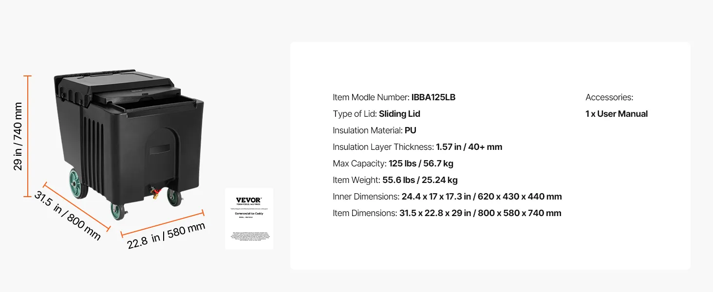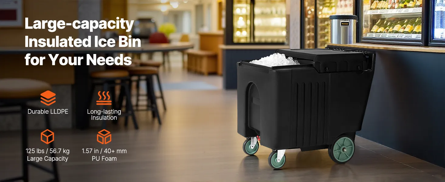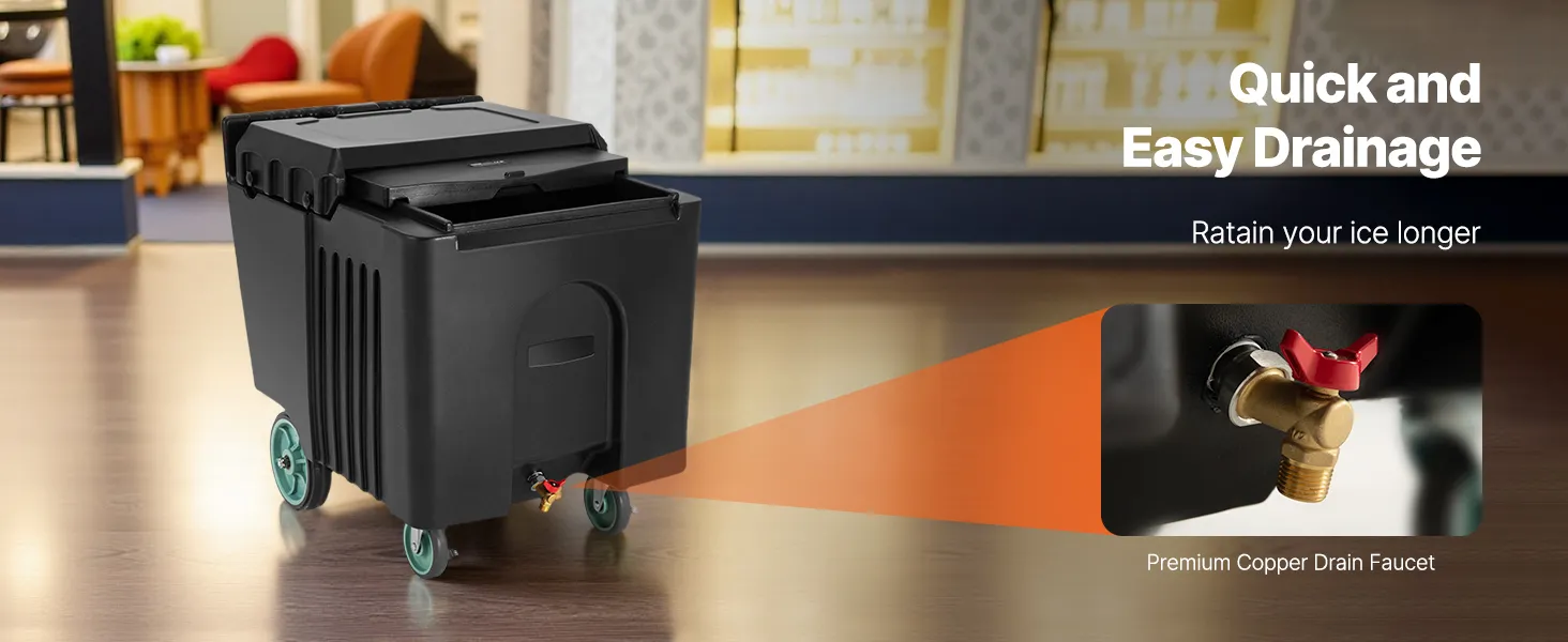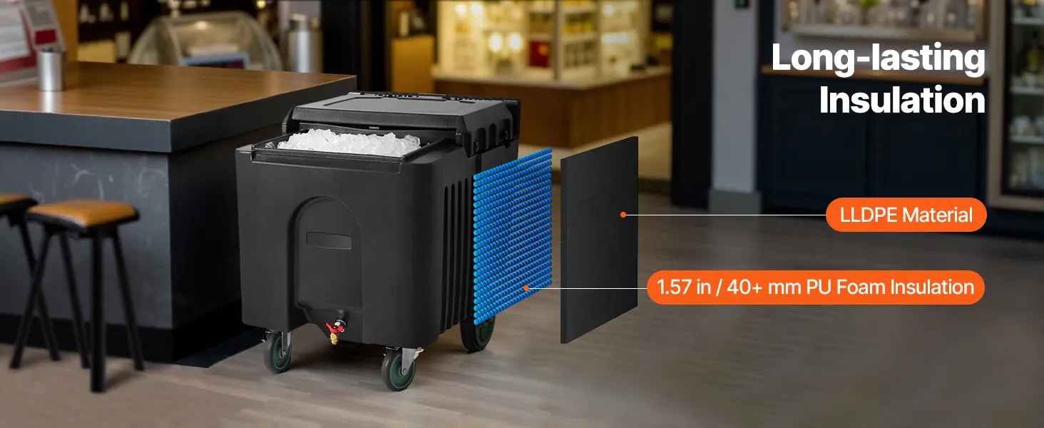 Liela ietilpība: ar iekšējiem izmēriem 620 x 430 x 440 mm mūsu komerciālais ledus konteiners nodrošina 56,7 kg ietilpību, kas atbilst visām jūsu dzesēšanas vajadzībām jebkurā pasākumā.