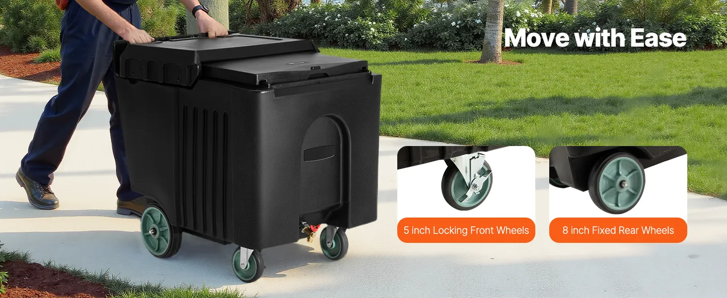 Četri riteņi ērtai pārvietošanai: aprīkots ar diviem fiksētiem aizmugurējiem riteņiem un diviem grozāmiem ar fiksāciju, ledus konteiners nodrošina gan stabilu novietošanu, gan vieglu pārvietošanu. Pat pilnībā piepildīts tas ļauj precīzi kontrolēt kustību.