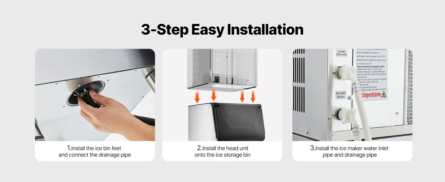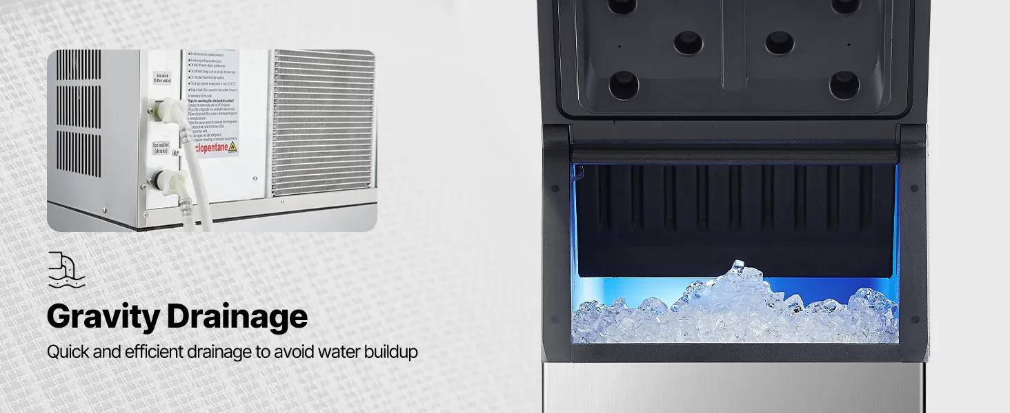 Gravitācijas drenāža: automātiskā drenāžas funkcija novērš ūdens uzkrāšanos, nodrošinot tīru un higiēnisku ledus uzglabāšanas vidi