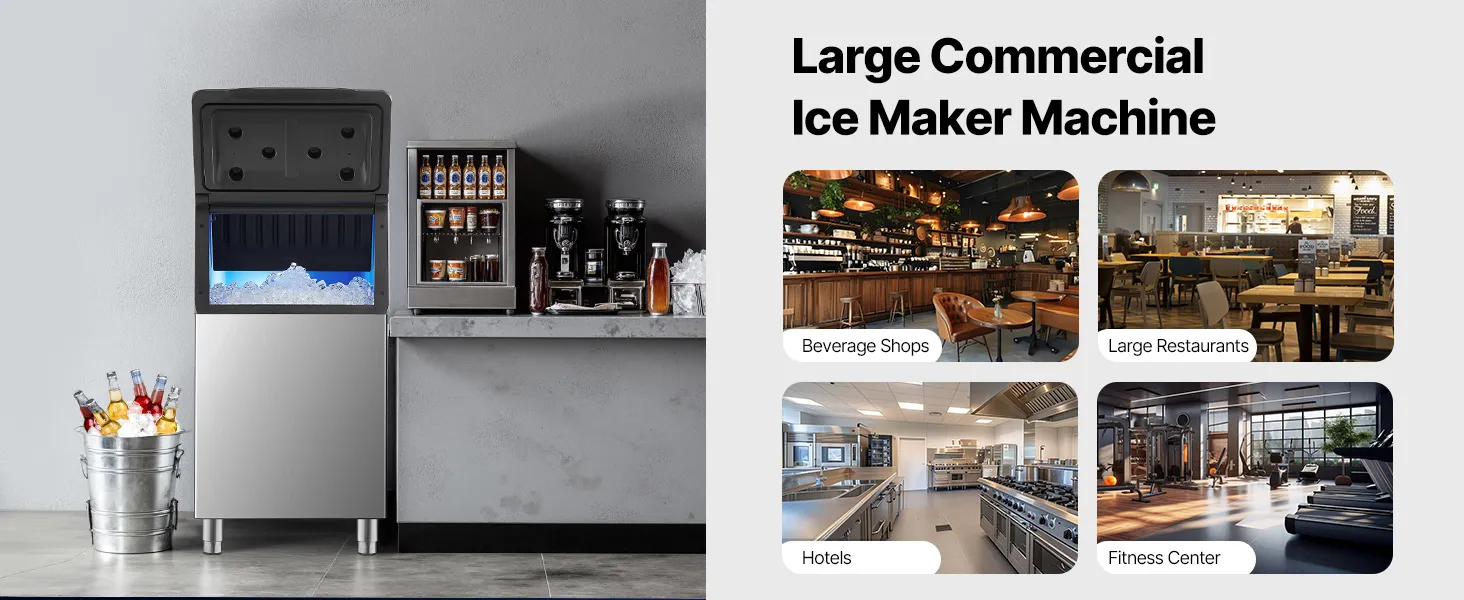 Komerciāla izmantošana: ledus uzglabāšanas konteiners nodrošina lielu ledus apjomu, kas padara to ideāli piemērotu profesionālām virtuvēm, restorāniem, bāriem, viesnīcām un dzērienu tirdzniecības vietām