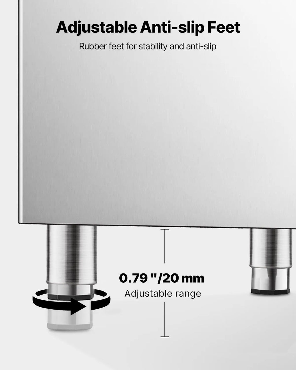Regulējamas gumijas kājas: konteiners aprīkots ar regulējamām kājām 15 mm augstumā. Gumijas pamatne nodrošina neslīdošu un triecienus absorbējošu funkciju, vienlaikus aizsargājot grīdu