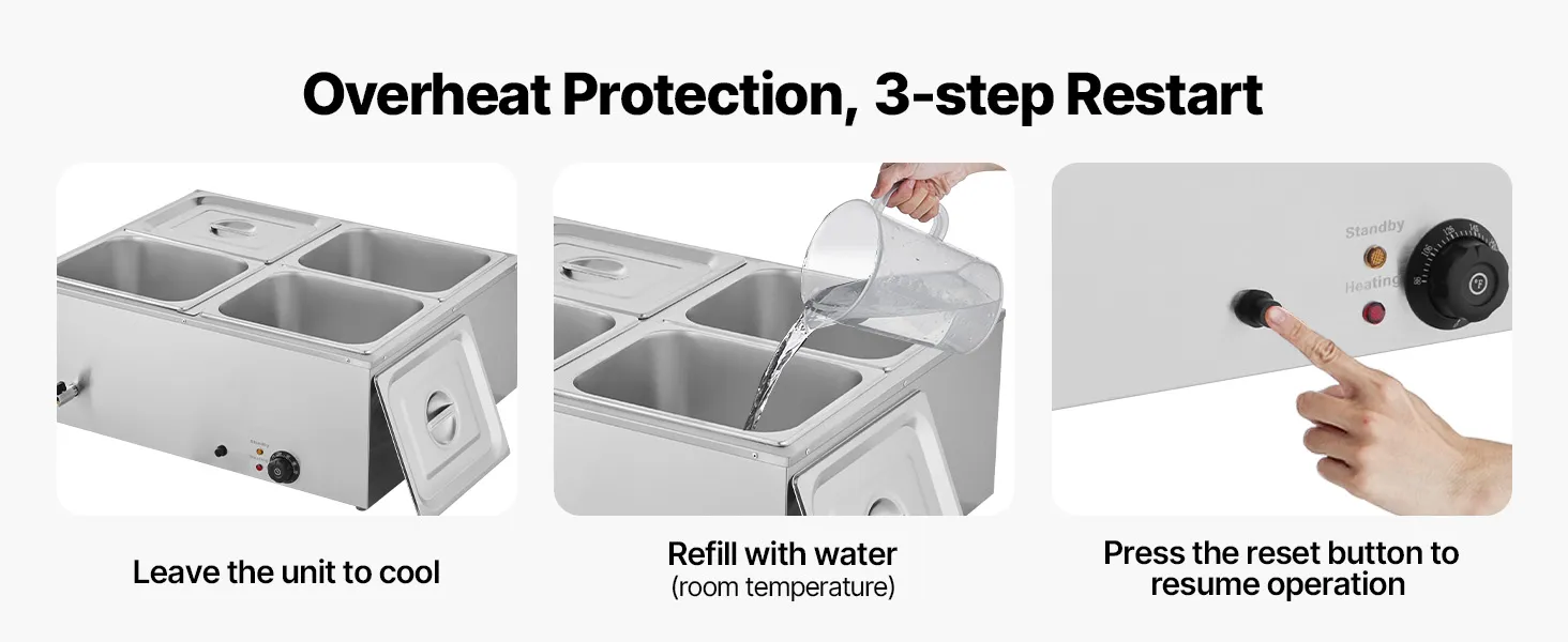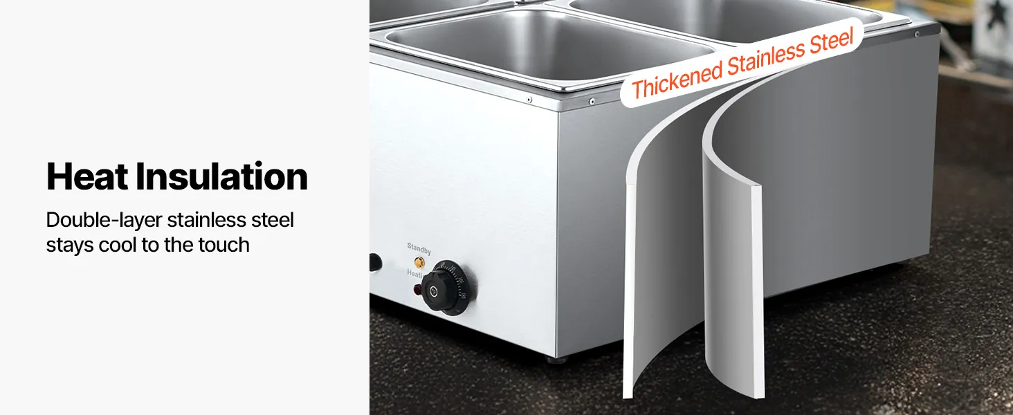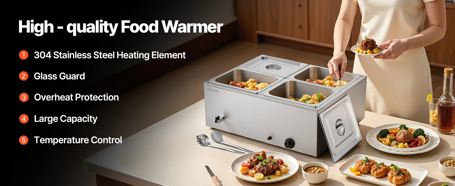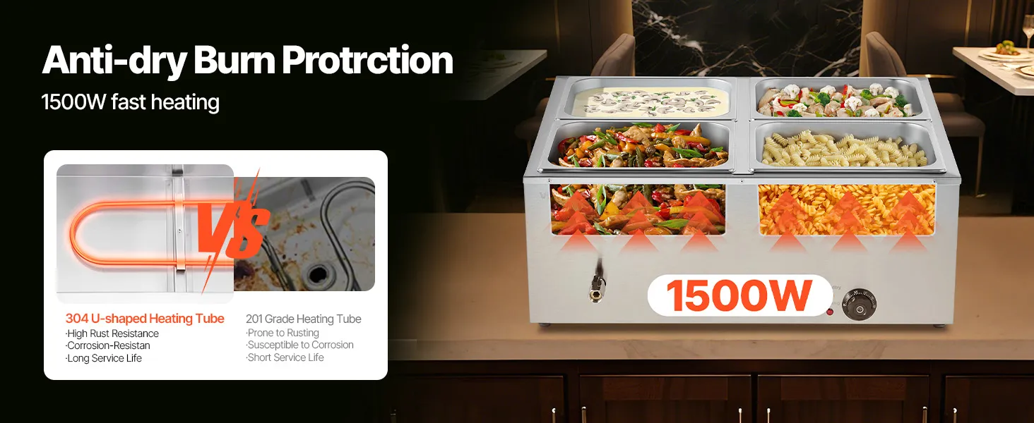 Izturīga konstrukcija: izgatavots no nerūsējošā tērauda, šis elektriskais pārtikas sildītājs nodrošina stabilu un uzticamu darbību. U-veida sildīšanas caurule vienmērīgi uzsilda ēdienu un saglabā efektivitāti ilgstošā lietošanā.