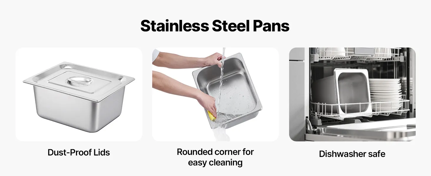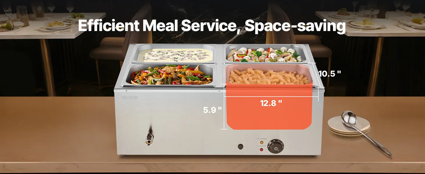 Liela ietilpība: ar standarta 15 cm dziļumu šis bufetes bain-marie ir aprīkots ar 4 x 1/2 izmēra traukiem, kas atbilst visām 15 cm dziļajām nodalījumu vietām. Tos var viegli kombinēt vai nomainīt, piemērojot ēdienkartei — no zupām un mērcēm līdz sautējumiem, siera mērcei vai šokolādei.