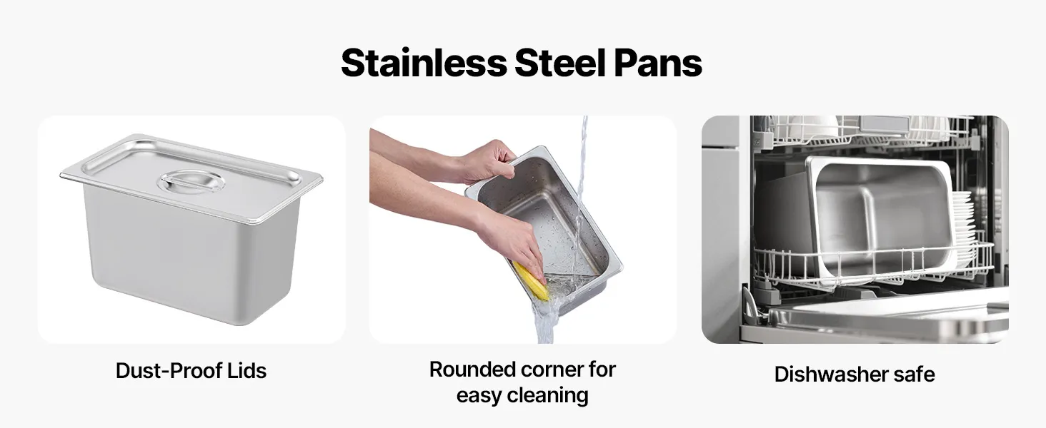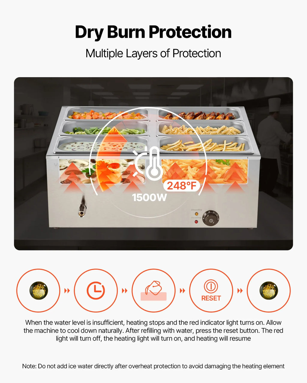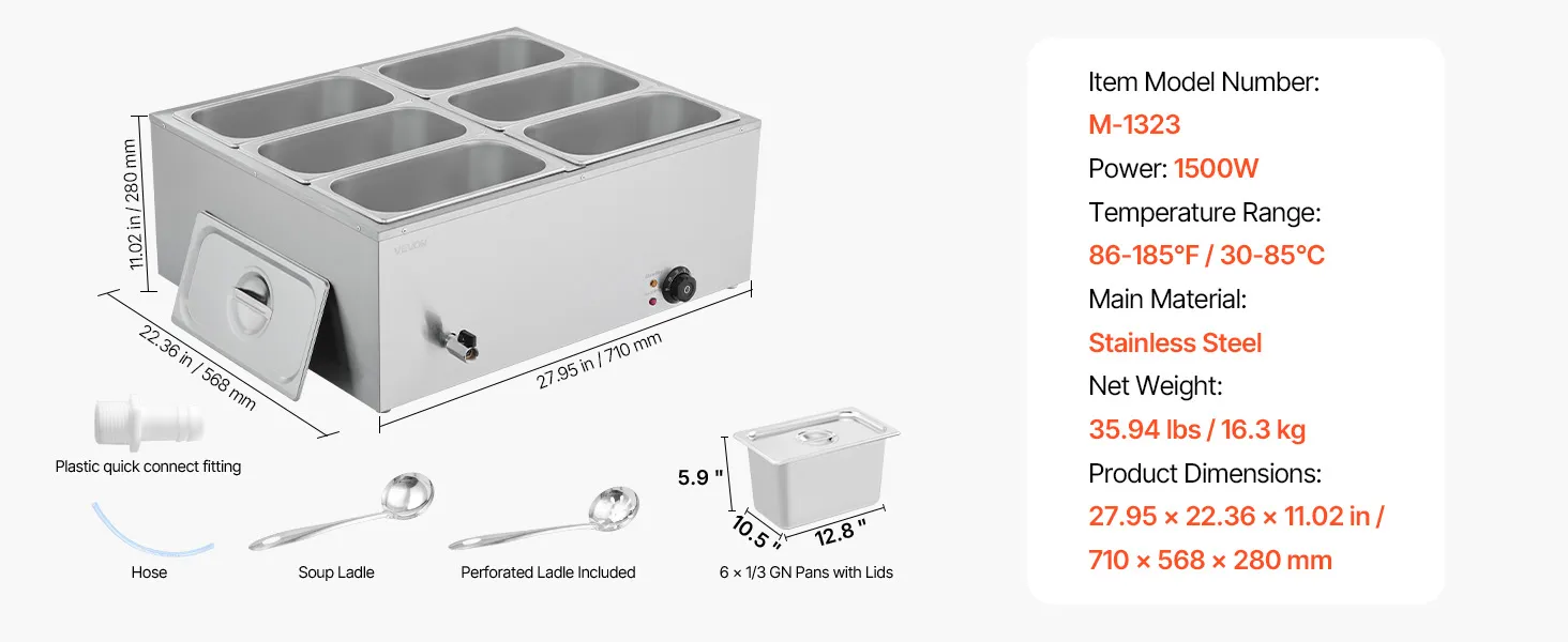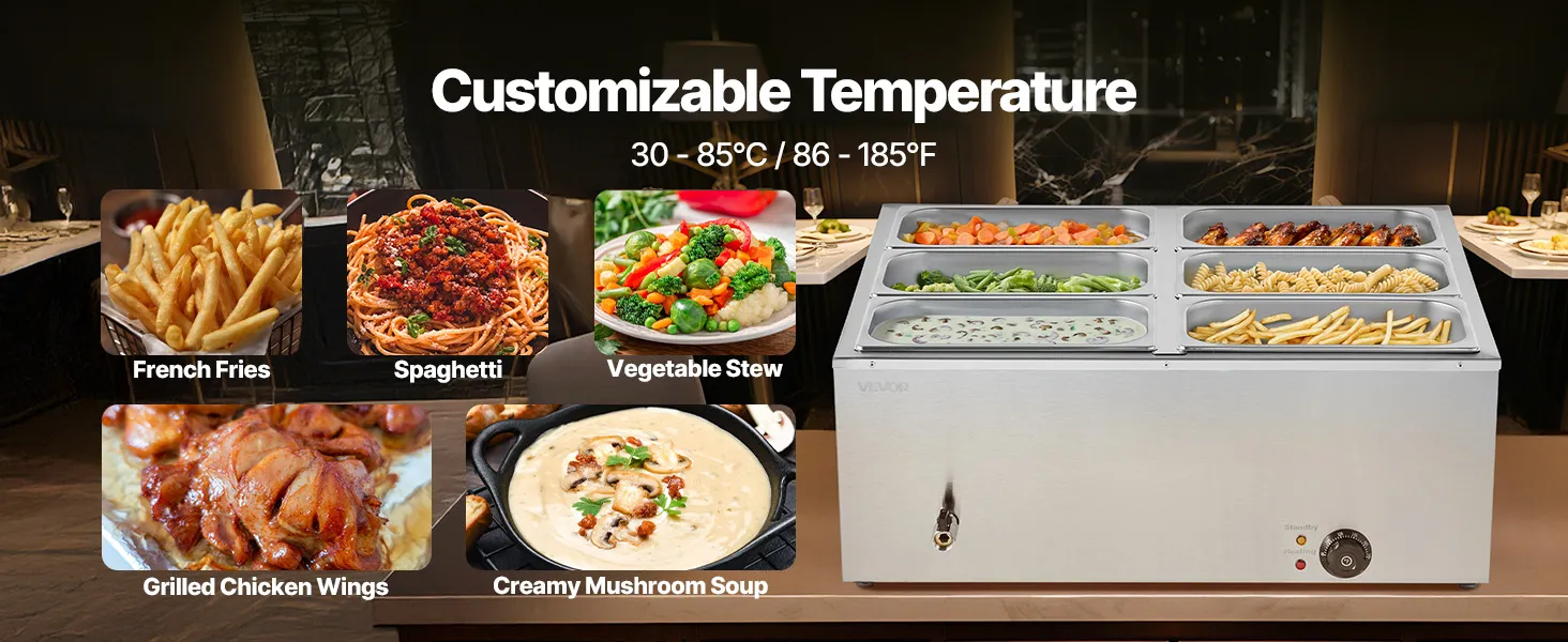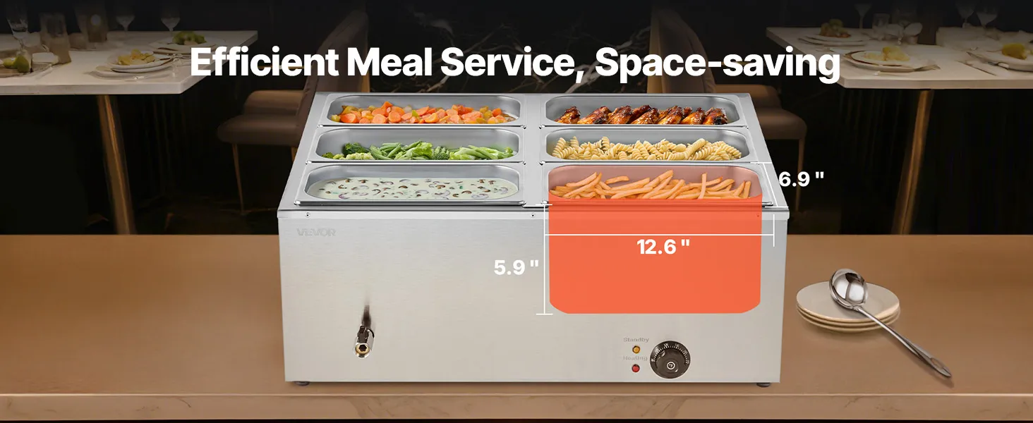 Liela ietilpība: ar standarta 15 cm dziļumu šis bufetes bain-marie ir aprīkots ar 6 x 1/3 izmēra traukiem, kas atbilst visām 15 cm dziļajām nodalījumu vietām. Tos var viegli kombinēt vai nomainīt, gatavojot zupas, mērces, sautējumus, siera mērci vai šokolādi.