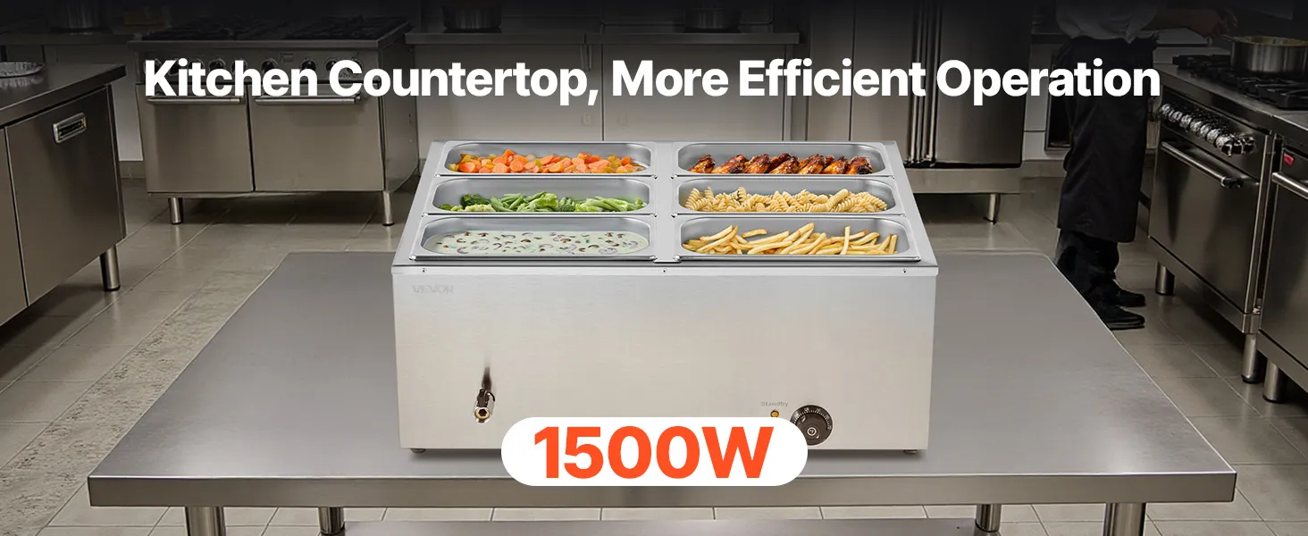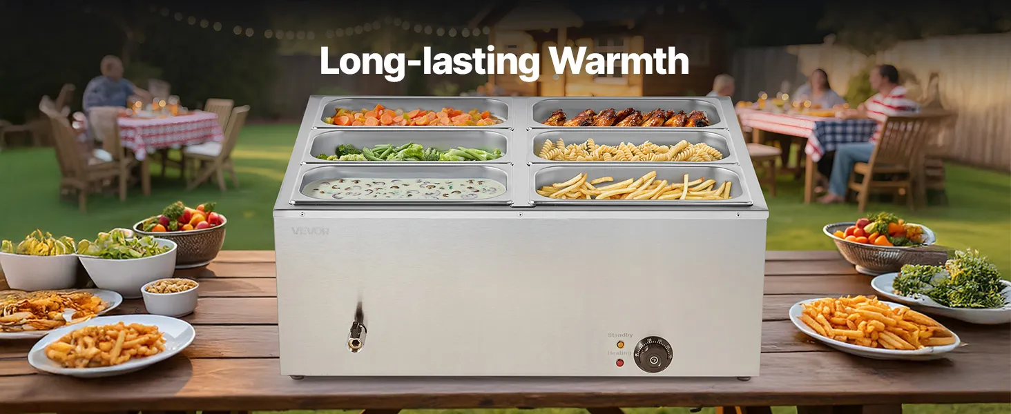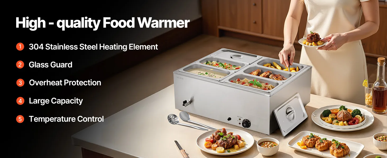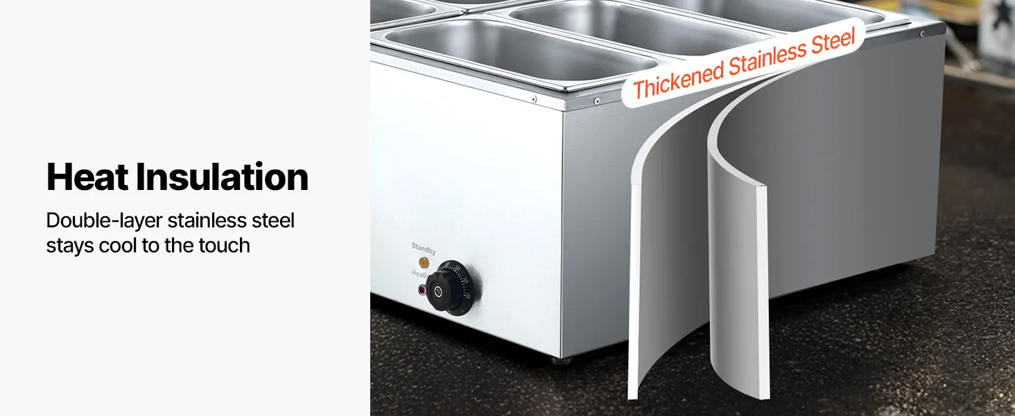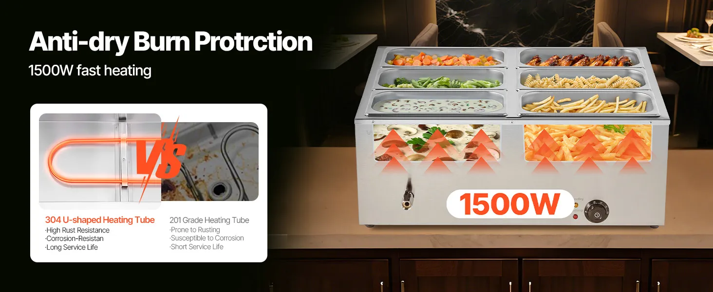 Izturīga konstrukcija: izgatavots no nerūsējošā tērauda, šis elektriskais pārtikas sildītājs nodrošina stabilu darbību. U-veida sildīšanas caurule vienmērīgi sadala siltumu un saglabā efektivitāti ilgstošā lietošanā.