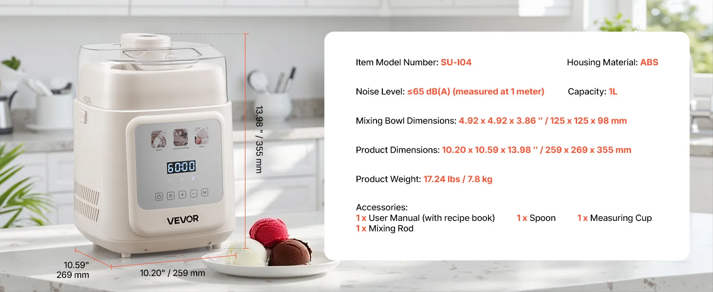 Kompakts vertikālais dizains: kompresora saldējuma mašīna ar 1 l ietilpību ir ideāli piemērota 1–2 porcijām. Vietu taupošais dizains neaizņem daudz vietas uz darba virsmas, nodrošinot ērtumu un funkcionalitāti.