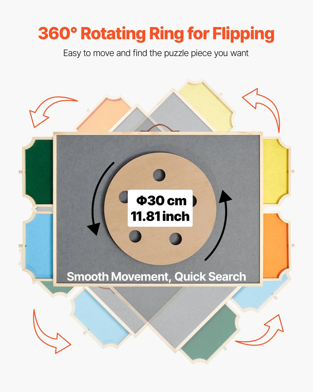 360° rotējoša pamatne: Šī pārnēsājamā puzles virsma nodrošina vienmērīgu 360° rotāciju. Dažu sekunžu laikā varat viegli pagriezt galdu vēlamajā pozīcijā. Tā piedāvā ērtu un aizraujošu veidu puzļu salikšanai.