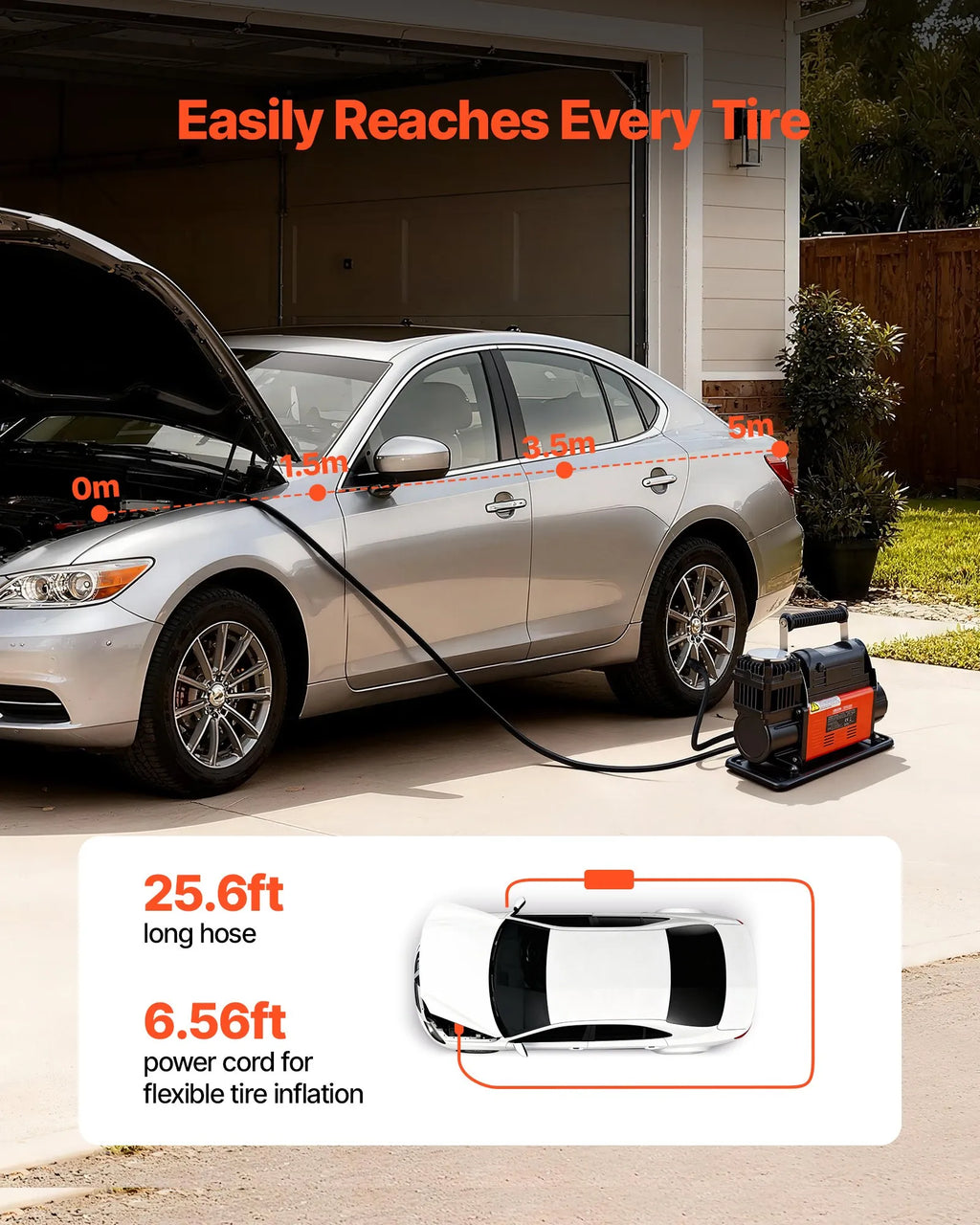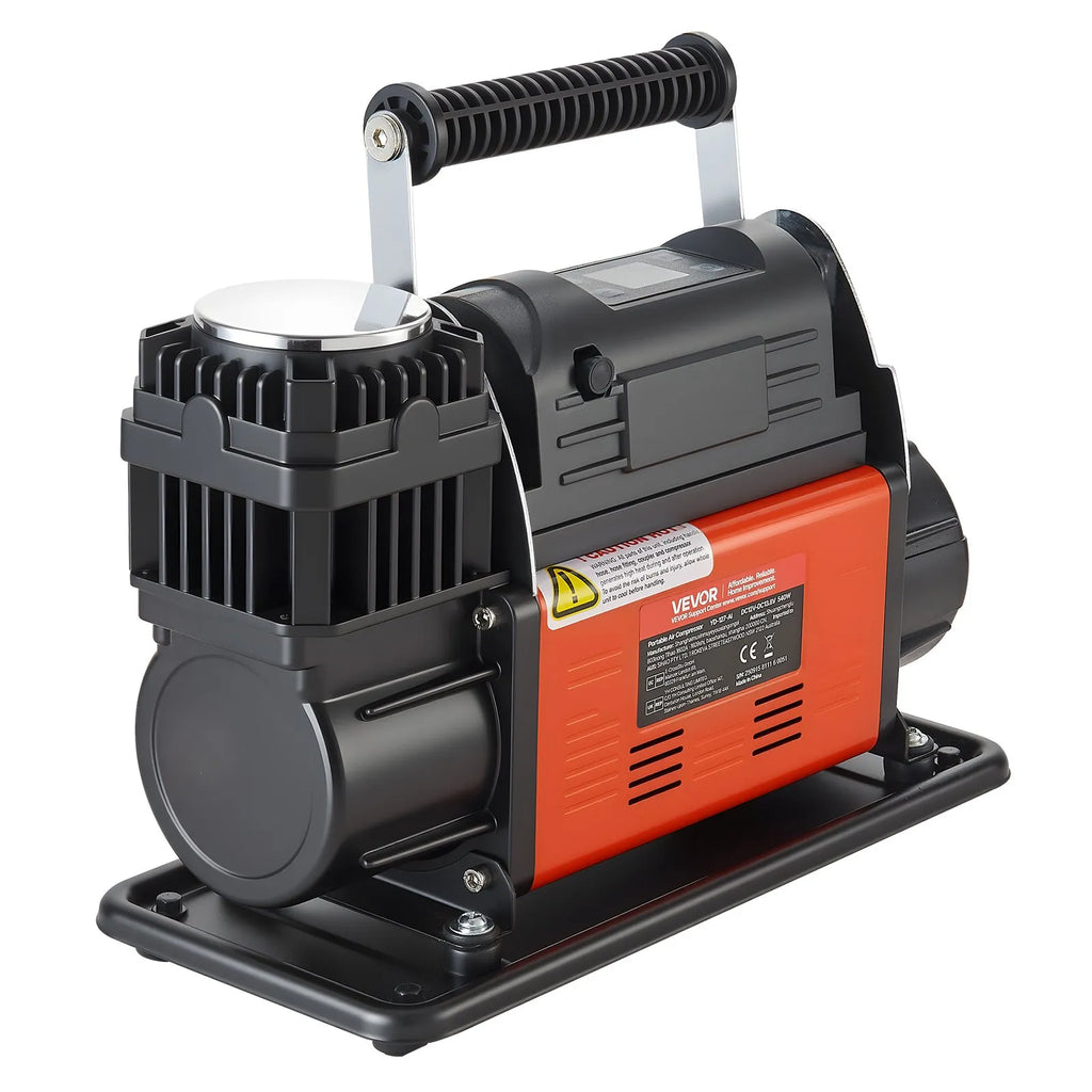 VEVOR 12 V lieljaudas gaisa kompresors ir uzticams palīgs ceļā. Tas ir aprīkots ar iepriekš iestatāma spiediena un automātiskas izslēgšanās funkcijām, kā arī skaidru LCD digitālo displeju. Maksimālais spiediens līdz 10,3 bar un gaisa plūsma 202 l/min nodrošina efektīvu transportlīdzekļu riepu piepumpēšanu, ļaujot ātri atgriezties uz ceļa.