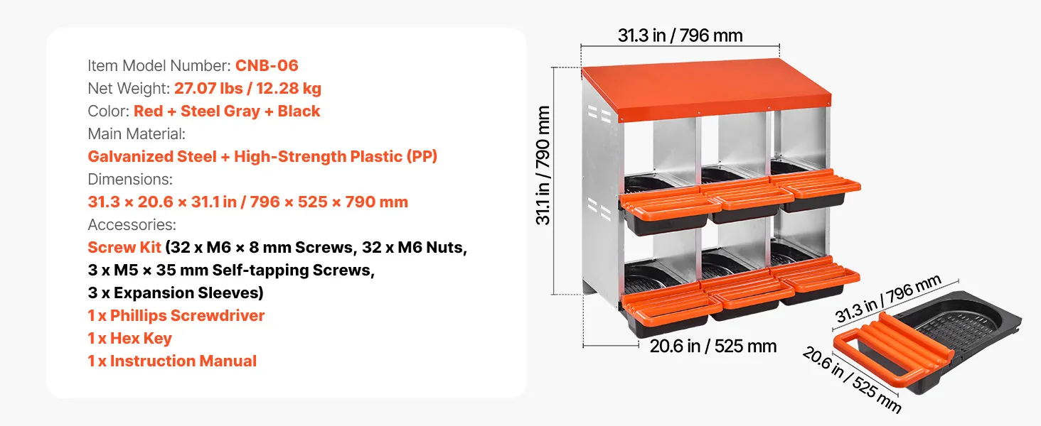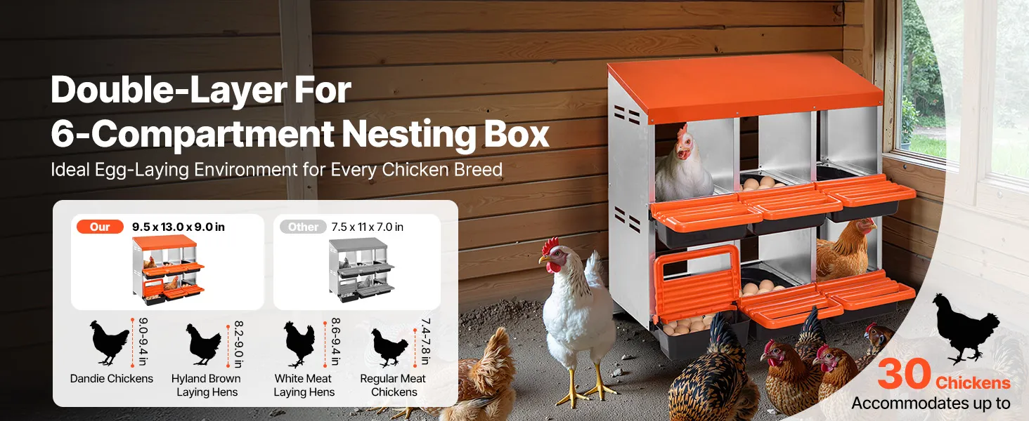 Mūsu vistas dējējkastei ir viegli kopjama konstrukcija ar 6 nodalījumiem vienā līmenī (30–45 in / 762–1067 mm). Katrā nodalījuma platums ir 265 mm, kas piemērots dažādām vistu šķirnēm. Viena kaste var saturēt līdz 5 vistu olām, nodrošinot efektīvu dēšanu.