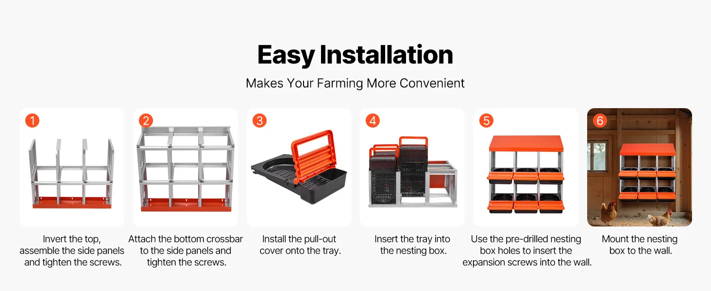Dējējkastes tiek saliktas ar skrūvēm un uzgriežņiem, kas ļauj uzstādīšanu veikt pat iesācējiem. Gludās sānu plāksnes nodrošina drošu apstrādi, bet lietotājam draudzīgais dizains ietaupa laiku un atvieglo olu savākšanu.