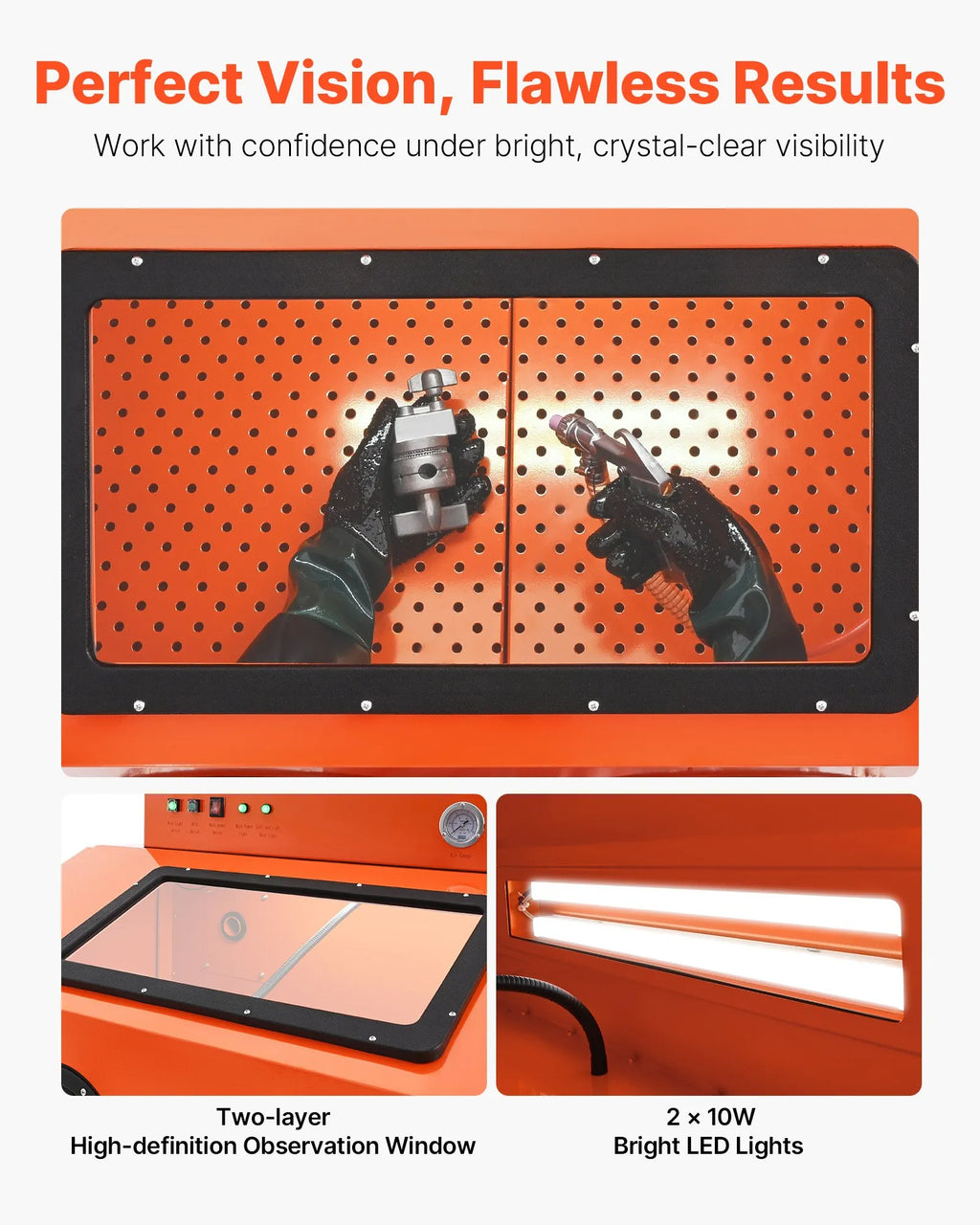 Efektīvi veiciet krāsas un rūsas noņemšanu no lielgabarīta detaļām augstvērtīgai virsmu apdarei ar šo 435 l smilšu strūklas kabīni. Ietilpīgā 1099 × 640 × 617 mm darba zona, 117 l abrazīvā materiāla tvertne un jaudīgais 1,2 kW putekļu savācējs nodrošina pietiekamu vietu un augstu efektivitāti liela apjoma projektiem.