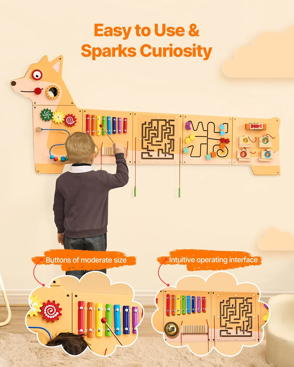 Gudra mācīšanās: Aktivitāšu sienas panelis attīsta roku–acu koordināciju, novērošanas prasmes un loģisko domāšanu, izmantojot daudzsensoru rotaļas. Tas veicina gan kognitīvo, gan motorisko prasmju attīstību un ir lielisks palīgs agrīnajā izglītībā.