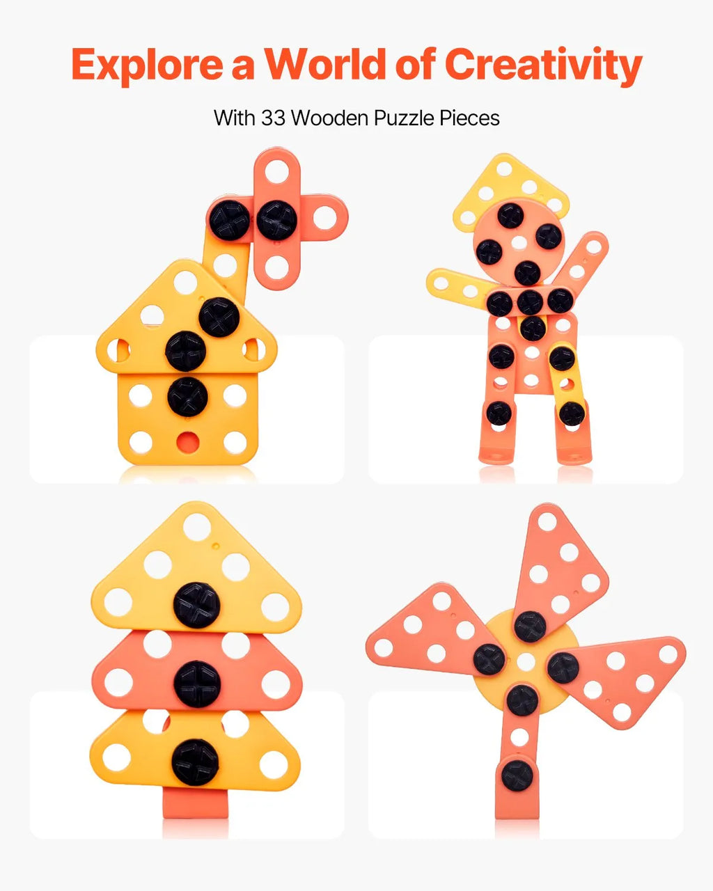 Dažādu konstrukciju veidošana: Ar dažādu formu klucīšiem bērni var radīt neskaitāmus dizainus. Šis darba galda rotaļu komplekts attīsta sīko motoriku un problēmu risināšanas prasmes, vienlaikus veicinot patstāvīgu rotaļu. Ideāli piemērots mazām rokām un lielām idejām.