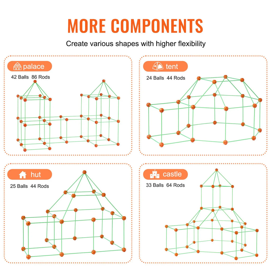 140 daļu forta būvēšanas komplekts: Atklājiet neierobežotas iespējas ar šo bērnu forta būvēšanas komplektu! Tajā ietilpst 44 izturīgas lodītes un 96 viegli, bet izturīgi savienojuma stieņi. Piemērots bērniem no 4 gadu vecuma 3D konstrukciju veidošanai — ar vecāku palīdzību var būvēt fortus, teltis, piramīdas, raķetes un daudz ko citu.