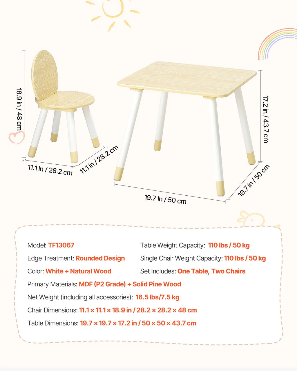 Produkta specifikācija Preces modeļa numurs: TF13067 Galda nestspēja: 50 kg Viena krēsla nestspēja: 49,9 kg Stūru apstrāde: Apaļots dizains Komplektā ietilpst: viens galds un divi krēsli Krāsa: balta + dabīgā koka Galvenie materiāli: MDF (P2 klase) + ciets priežu koks Neto svars (ar visām piederībām): 7,5 kg Krēsla izmēri (P × G × A): 28,2 × 28,2 × 48 cm Galda izmēri (P × G × A): 50 × 50 × 43,7 cm