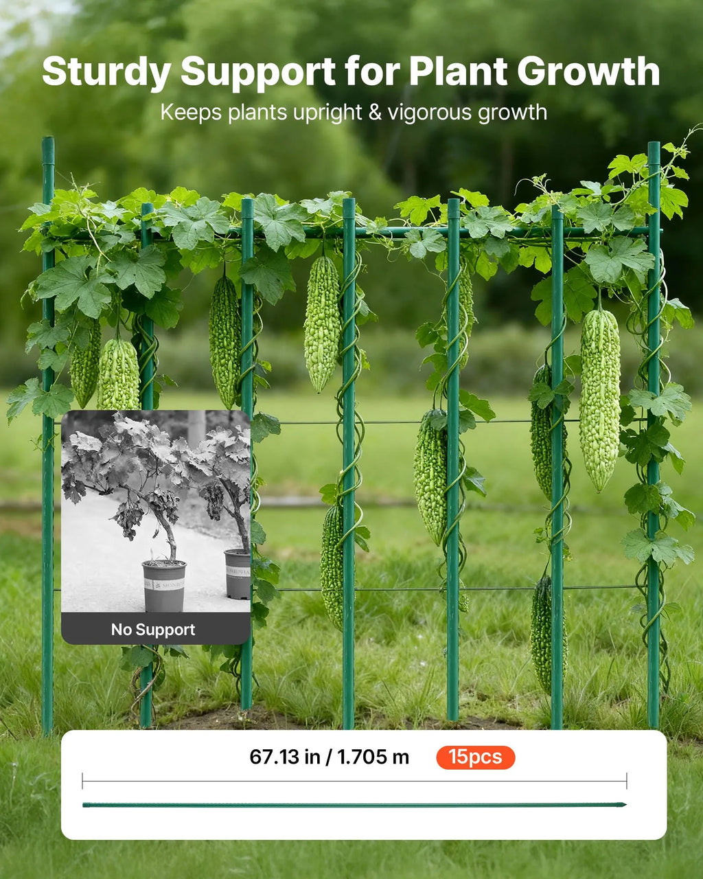 Izturīgs augu balsts: Šis dārza mietu komplekts ietver 15 mietus ar 1705 mm garumu un 16 mm diametru, kas paredzēti tomātu, pupiņu, vīteņaugu un citu augu balstīšanai. Papildu stabilitātei ieteicams izmantot piramīdas veida uzstādījumu, lai novērstu apgāšanos un veicinātu taisnu augšanu.