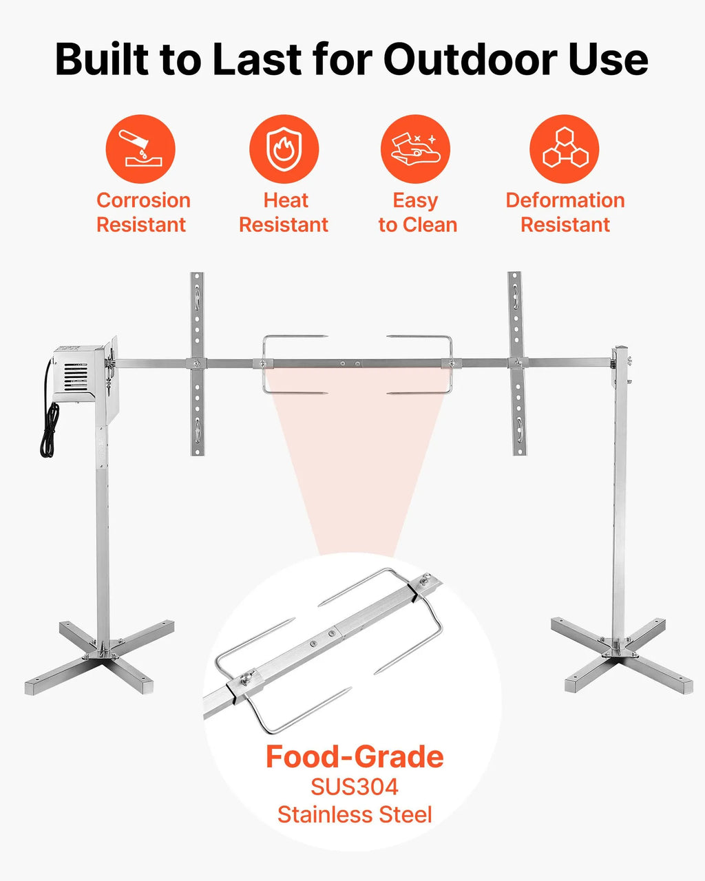 Nerūsējošā tērauda konstrukcija: Izgatavots no izturīga nerūsējošā tērauda, šis VEVOR rotācijas grila komplekts nodrošina noturību pret rūsu un vieglu tīrīšanu. Aprīkots ar SUS304 dakšām drošai saskarei ar pārtiku, tas garantē stabilu un efektīvu lietošanu intensīvai gatavošanai ārpus telpām.