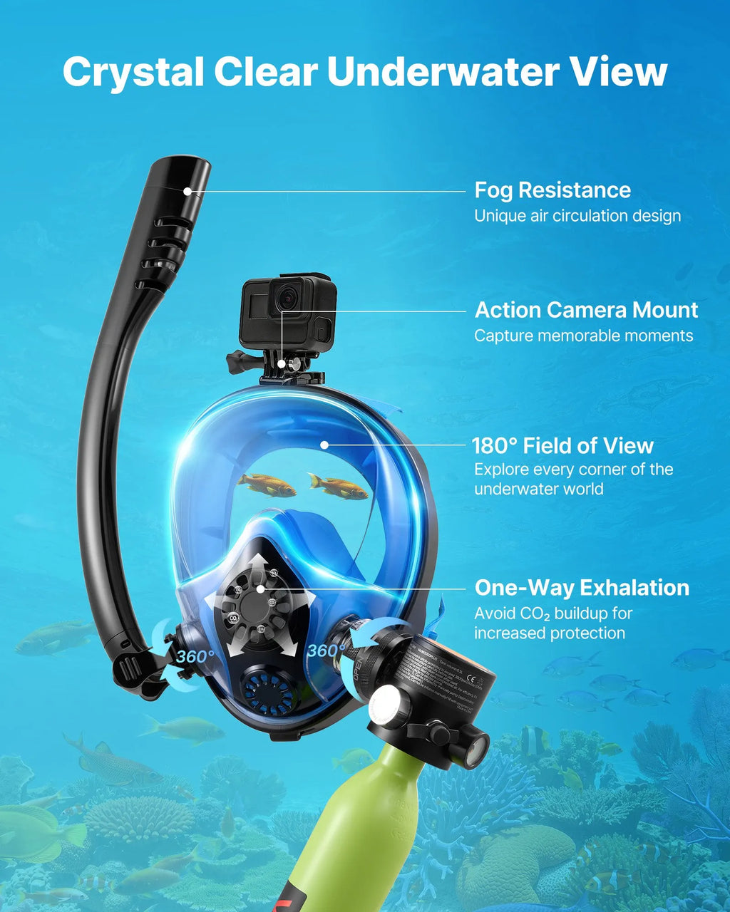 Pilnsejas niršanas maskai mūsu niršanas balonā ir pret miglas aizsardzības tehnoloģija un mīksts silikona apmales maliņas, savienota ar divām elpošanas šļūtenēm, nodrošinot plašu redzamību un ērtu lietošanu. Augšējais kameru stiprinājums ļauj viegli iemūžināt mirkļus — nav nepieciešams turēt kameru rokās!