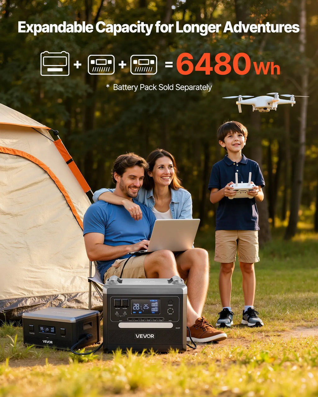 Aprīkota ar 2160 Wh LiFePO₄ akumulatoru, VEVOR 2400 W pārnēsājamā elektroenerģijas stacija nodrošina stabilu un ilgstošu enerģiju mājas rezerves vajadzībām vai lietošanai ārpus telpām. Piemērota tālruņu, apgaismojuma, kameru, ventilatoru, mini ledusskapju un citu ierīču darbināšanai.