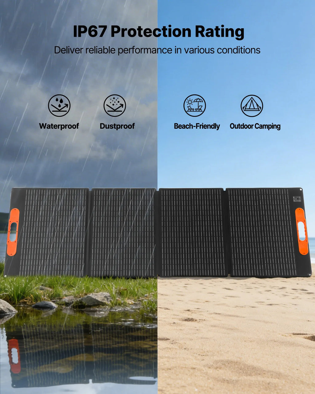 Komplektā iekļauti 2 × 200 W saules paneļi efektīvai saules enerģijas uztveršanai un ātrai uzlādei. Salokāmi un ērti pārnēsājami – piemēroti kempingam, ceļojumiem un ārkārtas situācijām.