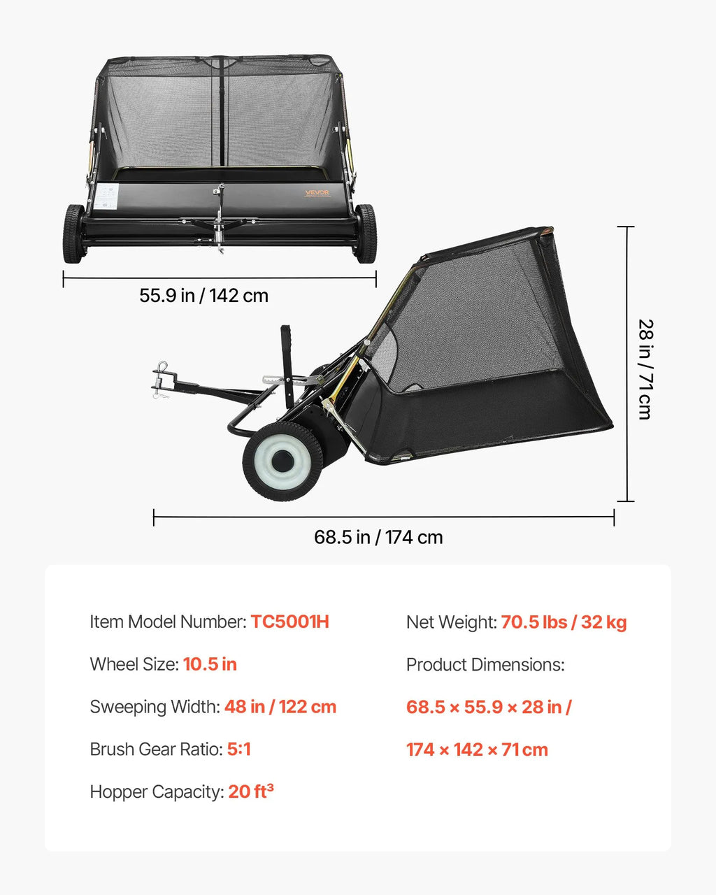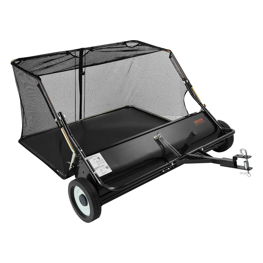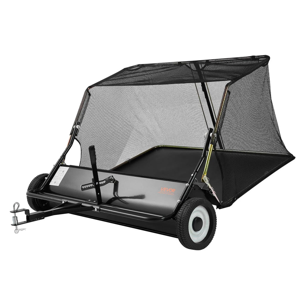 VEVOR piekabes tipa zāliena slaucītājs, 122 cm darba platums, 26 cu. ft savākšanas maiss, lapu un zāles savācējs ar iztukšošanas trosi, regulējams slaucīšanas augstums, dārzam un saimniecībai