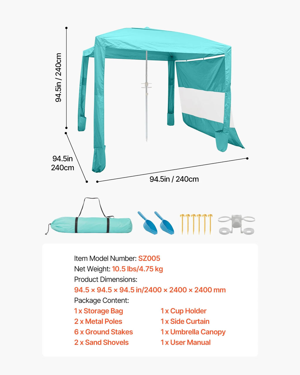 UPF 50+ aizsardzība pret sauli: Izgatavota no 210D saules izturīga auduma, pludmales kabana nodrošina ēnu un samazina saules apdegumu risku. Sānu aizkars ar elpojošu sietu veicina gaisa cirkulāciju un siltuma novadi, radot vēsāku vidi zem nojumes.