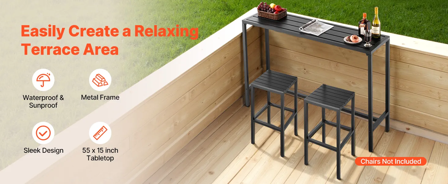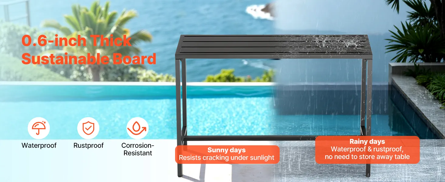 Āra bāra galds, 140 × 37,5 cm, ar ūdensizturīgu virsmu un stabilu metāla rāmi, taisnstūra letes augstuma galds balkoniem, pagalmiem, pie džakuzi, baseina vai iekštelpām